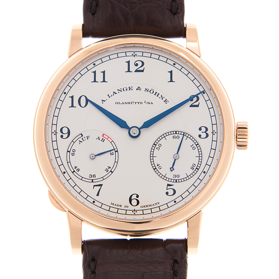 18kt rose gold case with a brown alligator leather strap. Fixed 18kt rose gold bezel. White dial with gold-tone alpha-style shape hands and Arabic numeral hour markers. Minute markers around the outer rim. Dial Type: Analog. Two - small second and power reserved indicator subdials. Hand wind movement with a 72-hour power reserve. Scratch resistant sapphire crystal. Screw down crown. Transparent case back. Round case shape. Case size: 39 mm. Tang clasp. Water resistant at 30 meters / 100 feet. Functions: hour, minute, small second, power reserved indicator. Additional Info: original box, international warranty card, manual (complete accessories). Luxury watch style. Watch label: Made in Germany. A. Lange Sohne 1815 18kt Rose Gold Mens Watch ALANGE234047.