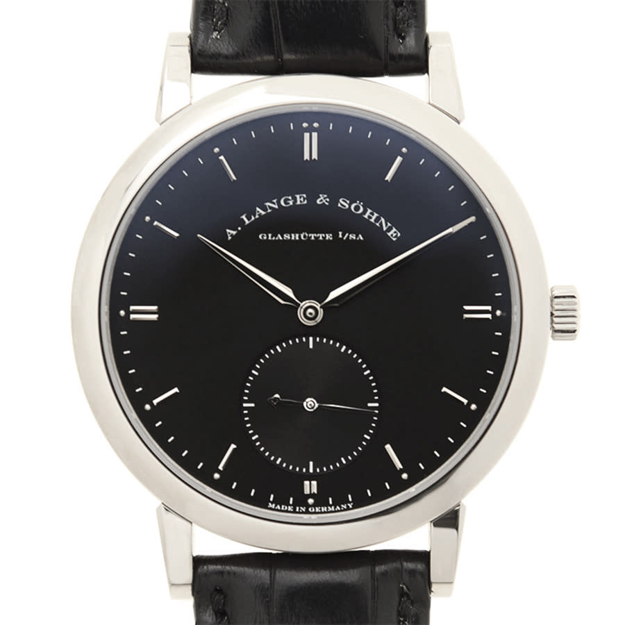 18kt white gold case with a black (alligator) leather strap. Fixed 18kt white gold bezel. Black dial with white gold hands and index hour markers. Minute markers around the outer rim. Dial Type: Analog. Small seconds sub-dial. Automatic movement with a 45-hour power reserve. Scratch resistant sapphire crystal. Screw down crown. Transparent case back. Round case shape. Case size: 40 mm. Case thickness: 8.2 mm. Tang clasp. Water resistant at 30 meters / 100 feet. Functions: hour, minute, second. Grand Saxonia Automatik Series. Luxury watch style. Watch label: Made in Germany. A. Lange Sohne Grand Saxonia Automatik Black Dial Mens Watch 307.029.