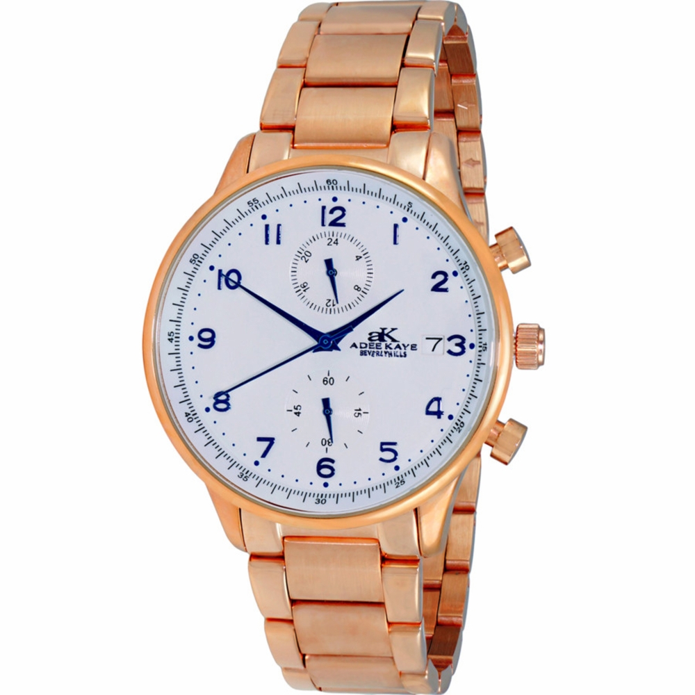Rose gold-tone stainless steel case and bracelet. Fixed rose gold-tone stainless steel bezel. White dial with blue hands and Arabic numeral & index hour markers. Minute scale around the inner rim. Dial Type: Analog. Date display at the 3 o'clock position. 24 hour subdials. Quartz movement. Scratch resistant mineral crystal. Pull / push crown. Solid case back. Round case shape, case size: 41 mm, case thickness: 12.75 mm. Band width: 20 mm, band length: 7.75 inches. Fold over with double push button release clasp. Water resistant at 50 meters / 165 feet. Functions: date, hour, minute, second. Ak7501-m Series. Casual watch style. Watch label: Japan Movt. Adee Kaye AK7501-M Quartz White Dial Mens Watch AK7501-MRGWT.