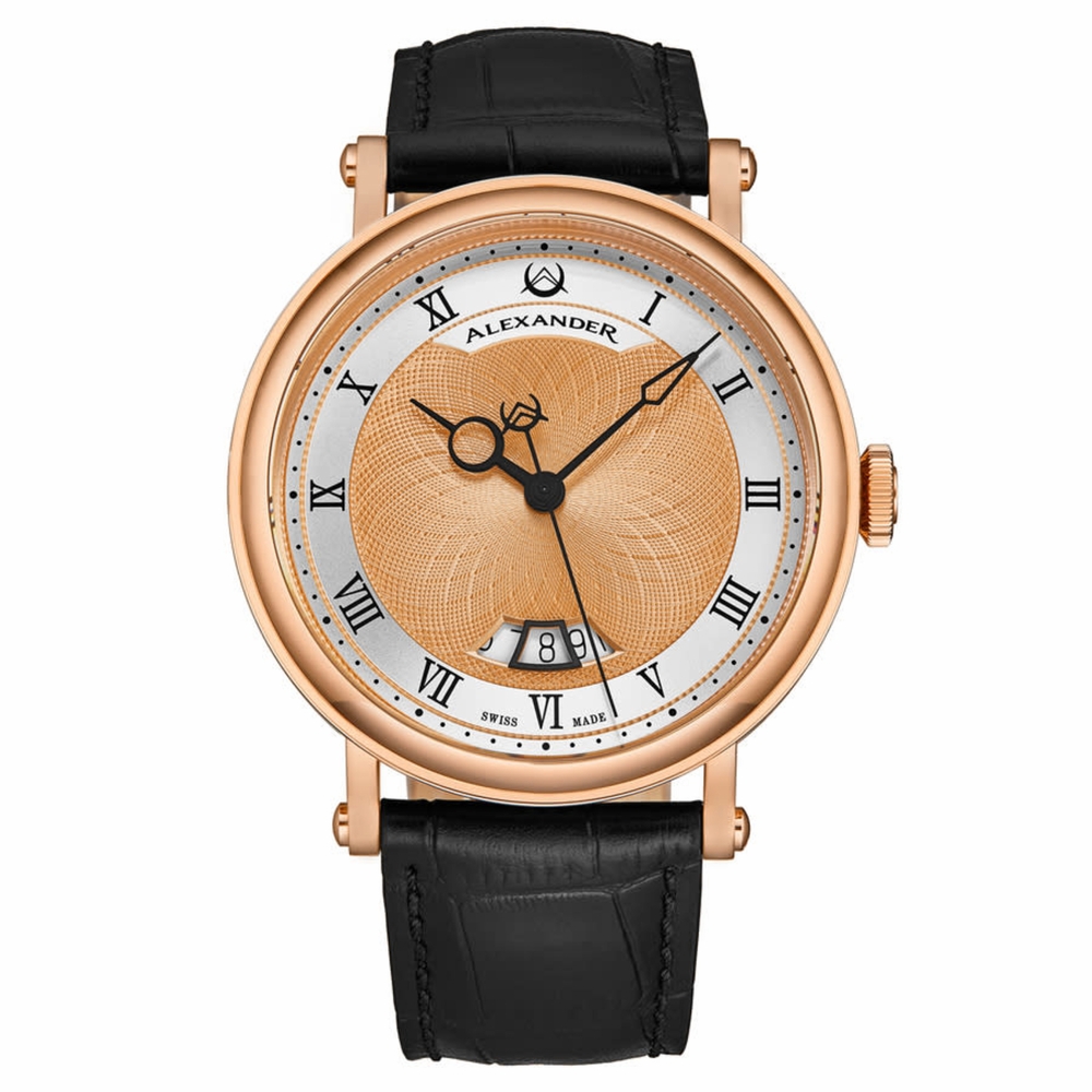 Rose gold-tone stainless steel case with a black genuine leather strap. Fixed rose gold-tone stainless steel bezel. Champagne dial with black hands and Roman numeral hour markers. Minute markers around the outer rim. Dial Type: Analog. Date display at the 6 o'clock position. Sellita Caliber SW 200 Automatic movement, based upon ETA 2824-2, containing 26 Jewels, bitting at 28800 vph, and has a power reserve of approximately 38 hours. Scratch resistant sapphire crystal. Pull / push crown. Transparent case back. Round case shape, case size: 43 mm, case thickness: 10.8 mm. Band width: 22 mm, band length: 7.75 inches. Deployment with push button release clasp. Water resistant at 30 meters / 100 feet. Functions: date, hour, minute, second. Alexander 2 Series. Luxury watch style. Watch label: Swiss Made. Alexander Alexander 2 Automatic Champagne Dial Mens Watch A153-05.