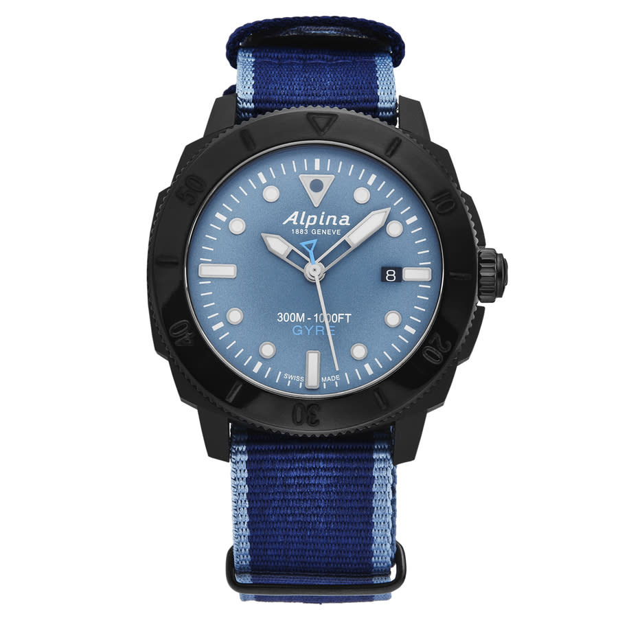 Black-plated stainless steel case with a blue nylon NATO strap. Uni-directional rotating black-plated bezel. Blue dial with luminous silver-tone hands and dot hour markers. Minute markers around the outer rim. Dial Type: Analog. Luminescent hands and markers. Date display at the 3 o'clock position. Alpina calibre AL-525 automatic movement, based upon Sellita SW200-1, containing 26 Jewels, bitting at 28800 vph, and has a power reserve of approximately 38 hours. Scratch resistant sapphire crystal. Screw down crown. Solid case back. Round case shape. Case size: 44 mm. Case thickness: 12.15 mm. Band width: 22.5 mm. Band length: 8 inches. Tang clasp. Water resistant at 300 meters / 1000 feet. Functions: date, hour, minute, second. Additional Info: hours, minutes, seconds, date. Seastrong Diver Gyre Series. Luxury watch style. Watch label: Swiss Made. Alpina Seastrong Diver Gyre Automatic Blue Dial Mens Watch AL-525LNB4VG6.