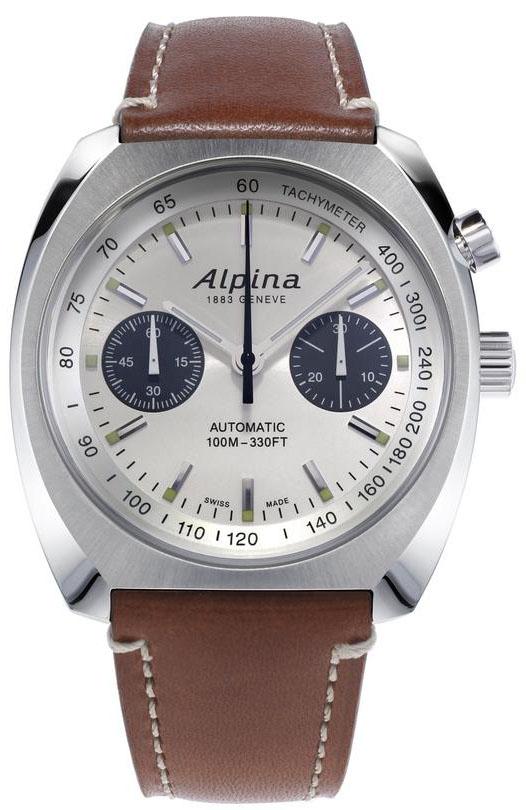 Silver-tone stainless steel case with a brown leather strap. Fixed silver-tone stainless steel bezel. Silver dial with silver-tone hands and index hour markers. Tachymeter scale around the inner rim. Dial Type: Analog. Luminescent hands and markers. Chronograph - sub-dials displaying: 30 minutes, 60 seconds. Alpina Calibre AL-727 automatic movement. Scratch resistant sapphire crystal. Solid case back. Cushion case shape, case size: 42 mm, case thickness: 14.5 mm. Buckle clasp. Water resistant at 100 meters / 330 feet. Functions: chronograph, hour, minute, second. Startimer Pilot Heritage Series. Watch label: Swiss Made. Alpina Startimer Pilot Heritage Chronograph Automatic Silver Dial Mens Watch AL-727SS4H6.