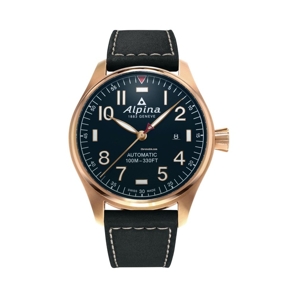 Rose gold-plated stainless steel case with a navy blue leather strap. Fixed rose gold-plated bezel. Navy blue dial with luminous rose gold-tone hands and Arabic numeral hour markers. Minute markers around the outer rim. Dial Type: Analog. Luminescent hands and markers. Date display at the 3 o'clock position. Alpina calibre AL-525 automatic movement, based upon Sellita SW200-1, containing 26 Jewels, bitting at 28800 vph, and has a power reserve of approximately 38 hours. Scratch resistant sapphire crystal. Screw down crown. Solid case back. Round case shape. Case size: 44 mm. Case thickness: 13 mm. Band width: 22 mm. Tang clasp. Water resistant at 100 meters / 330 feet. Functions: date, hour, minute, second. Startimer Pilot Series. Pilot watch style. Watch label: Swiss Made. Alpina Startimer Pilot Automatic Navy Blue Dial Mens Watch AL-525NN4S4.