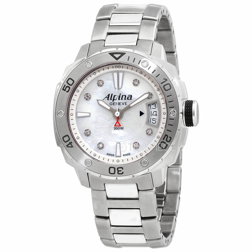 Stainless steel case with a stainless steel bracelet. Uni-directional rotating bezel. Mother-of-pearl dial with diamond/ index hour markers. Minute markers around the outer rim. Dial Type: Analog. Luminescent hands and markers. Date display at the 3 o'clock position. Quartz movement. Scratch resistant sapphire crystal. Screw down crown. Case diameter: 38 mm. Round case shape. Folding clasp. Water resistant at 300 meters / 984 feet. Functions: date, hour, minute, second. Dress watch style. Watch label: Swiss Made. Alpina Seastrong Mother-of-Pearl Dial Stainless Steel Watch 240LSD3V6B.