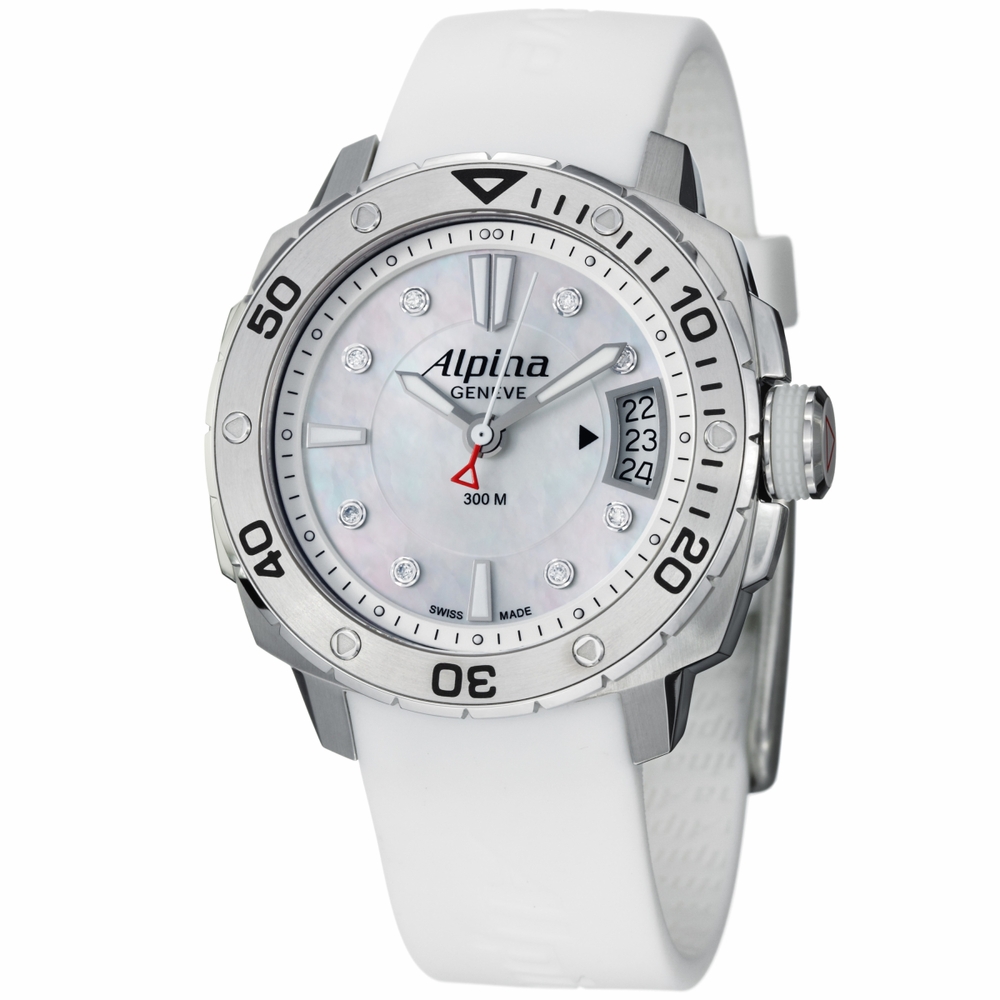 Stainless steel case with a white rubber strap. Unidirectional rotating bezel with markers. White mother of pearl dial with silver-tone hands and diamond hour markers. Index markers mark the quarter hour positions. Minute markers around the outer rim. Dial Type: Analog. Luminescent hands and markers. Date display at the 3 o'clock position. Swiss quartz movement. Scratch resistant anti-reflective sapphire crystal. Screw down crown. Solid case back. Case diameter: 38 mm. Case thickness: 10 mm. Round case shape. Band width: 18 mm. Tang clasp. Water resistant at 300 meters / 1000 feet. Functions: date, hour, minute, second. Luxury watch style. Watch label: Swiss Made. Alpina Extreme Diver 300 White Dial White Rubber Strap Ladies Watch AL240LSD3V6.