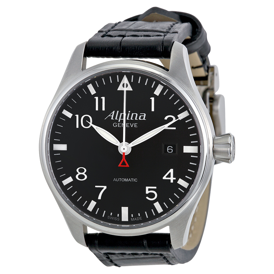 Stainless steel case with a black calfskin leather strap. Fixed stainless steel bezel. Black dial with silver-tone hands and Arabic numeral hour markers. Index markers mark the 3, 6 and 9 o'clock positions. a triangle shape marks the 12 o'clock position. minute markers around the outer rim. Dial Type: Analog. Luminescent hands. Date display at the 3 o'clock position. Alpina Calibre AL-525 automatic movement with a 38-hour power reserve. Scratch resistant anti-reflective sapphire crystal. Transparent screw in case back. Round case shape, case size: 40 mm, case thickness: 11 mm. Band width: 20 mm. Tang clasp. Water resistant at 100 meters / 330 feet. Functions: date, hour, minute, second. Luxury watch style. Watch label: Swiss Made. Alpina Startimer Pilot Automatic Black Dial Leather Strap Mens Watch AL525B3S6.