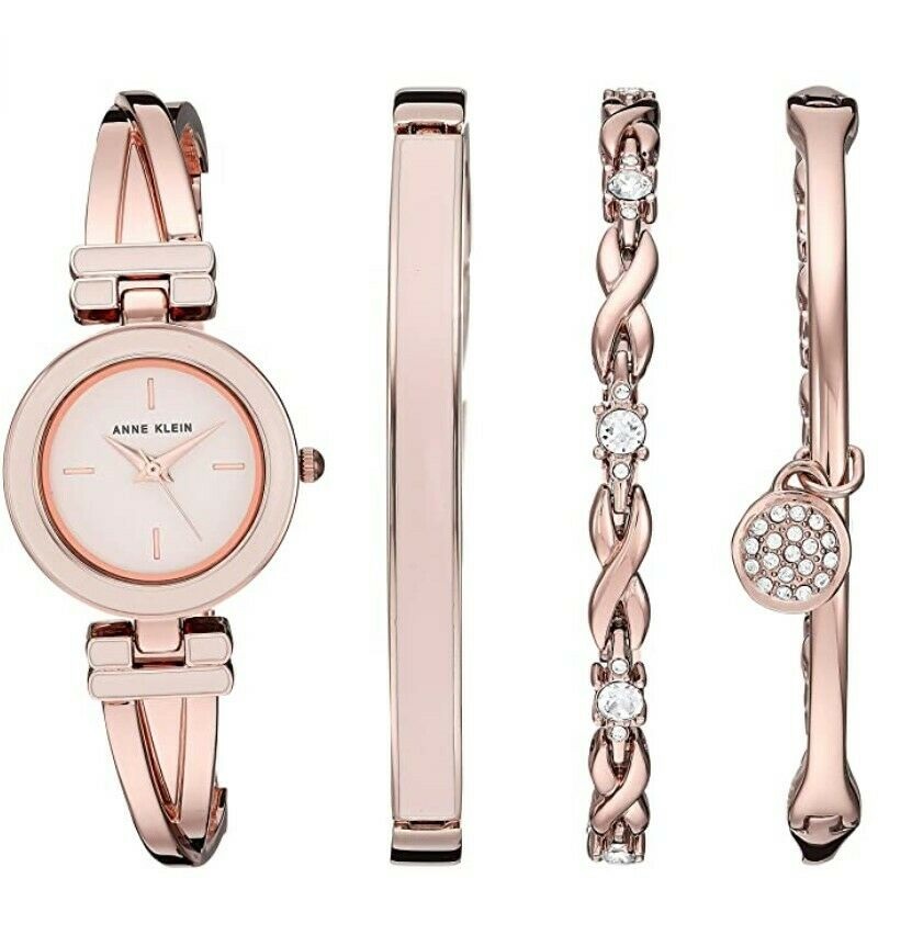 Rose gold-tone metal case with a rose gold-tone metal (x-shaped) bracelet. Fixed rose gold-tone metal bezel with a blush pink enamel inlay. Glossy blush pink dial with rose gold-tone hands. Index markers appear at the 3, 6, 9 and 12 o'clock positions. Dial Type: Analog. Quartz movement. Scratch resistant mineral crystal. Pull / push crown. Solid case back. Round case shape. Case size: 24.5 mm. Case thickness: 7 mm. Band width: 12.5 mm. Jewelry clasp. Water resistant at 30 meters / 100 feet. Functions: hour, minute, second. Additional Info: set includes three rose gold-tone bracelets; one bangle with blush pink enamel filling, one Swarovski crystal accented x link bracelet and one bangle. Dress watch style. Watch label: Japan Movt. Anne Klein Quartz Glossy Blush Pink Dial Ladies Watch and Bracelet Set AK/3284LPST.