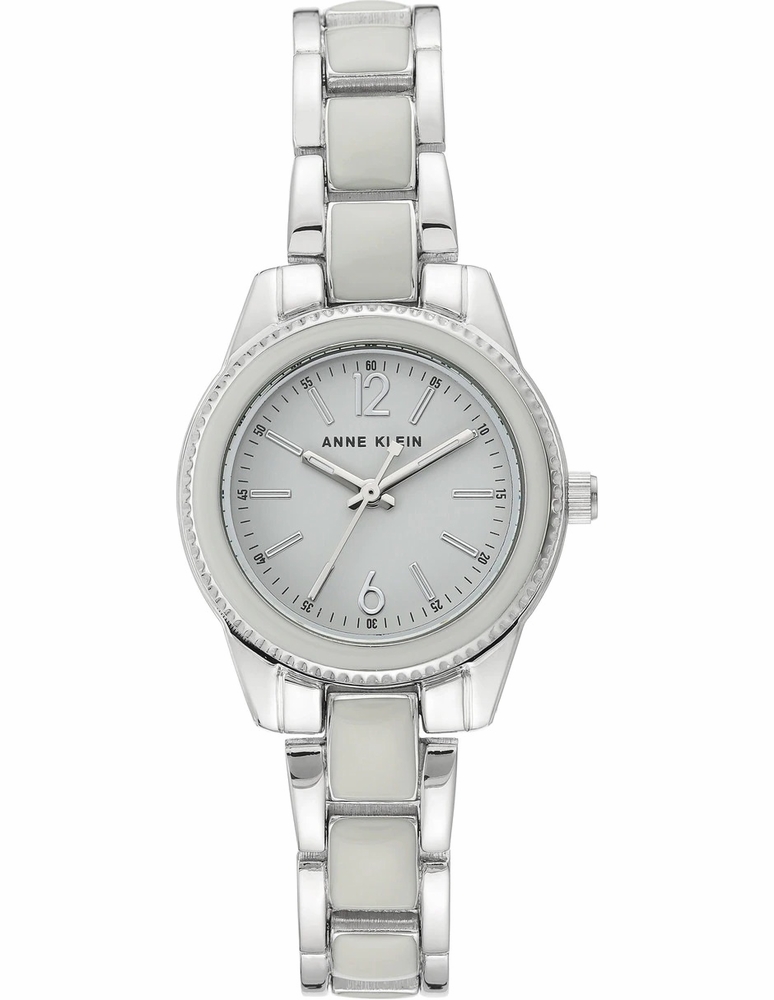 Silver-tone metal case with a stainless steel bracelet with an inlaid pearl enamel links. Fixed siulver-tone metal bezel with an inlaid pearl enamel ring. Pearl dial with luminous silver-tone hands and index hour markers. Arabic numeral at 6 and 12 o' clock positions. Arabic numeral minute markers (at 5 minute intervals). Minute markers around the outer rim. Dial Type: Analog. Luminescent hands and markers. Quartz movement. Scratch resistant mineral crystal. Pull / push crown. Solid case back. Round case shape. Case dimensions: 30 mm x 35.5 mm. Case thickness: 9 mm. Band width: 16 mm. Jewelry clasp. Water resistant at 30 meters / 100 feet. Functions: hour, minute, second. Trend Series. Casual watch style. Anne Klein Trend Quartz Pearl Dial Ladies Watch AK/3315LGSV.
