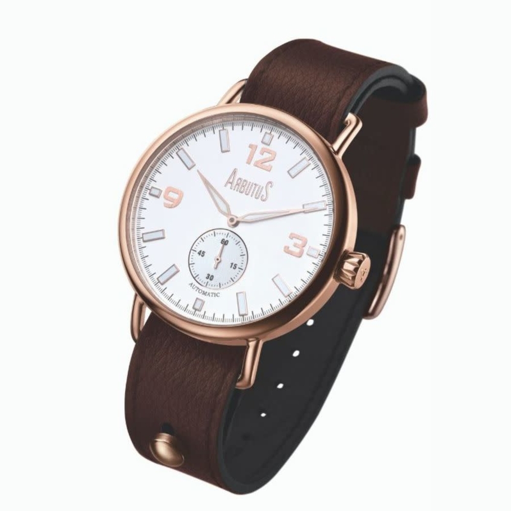 Rose gold-tone stainless steel case with a brown genuine leather strap. Fixed rose gold-tone stainless steel bezel. White dial with rose gold-tone hands and Arabic numeral & index hour markers. Minute markers around the outer rim. Dial Type: Analog. Luminescent hands and markers. Automatic movement. Scratch resistant sapphire crystal. Pull / push crown. Transparent case back. Round case shape, case size: 40 mm. Tang clasp. Water resistant at 50 meters / 165 feet. Functions: hour, minute, second. 5th Ave Series. Dress watch style. Arbutus 5th Ave White Dial Mens Watch AR603RWF.