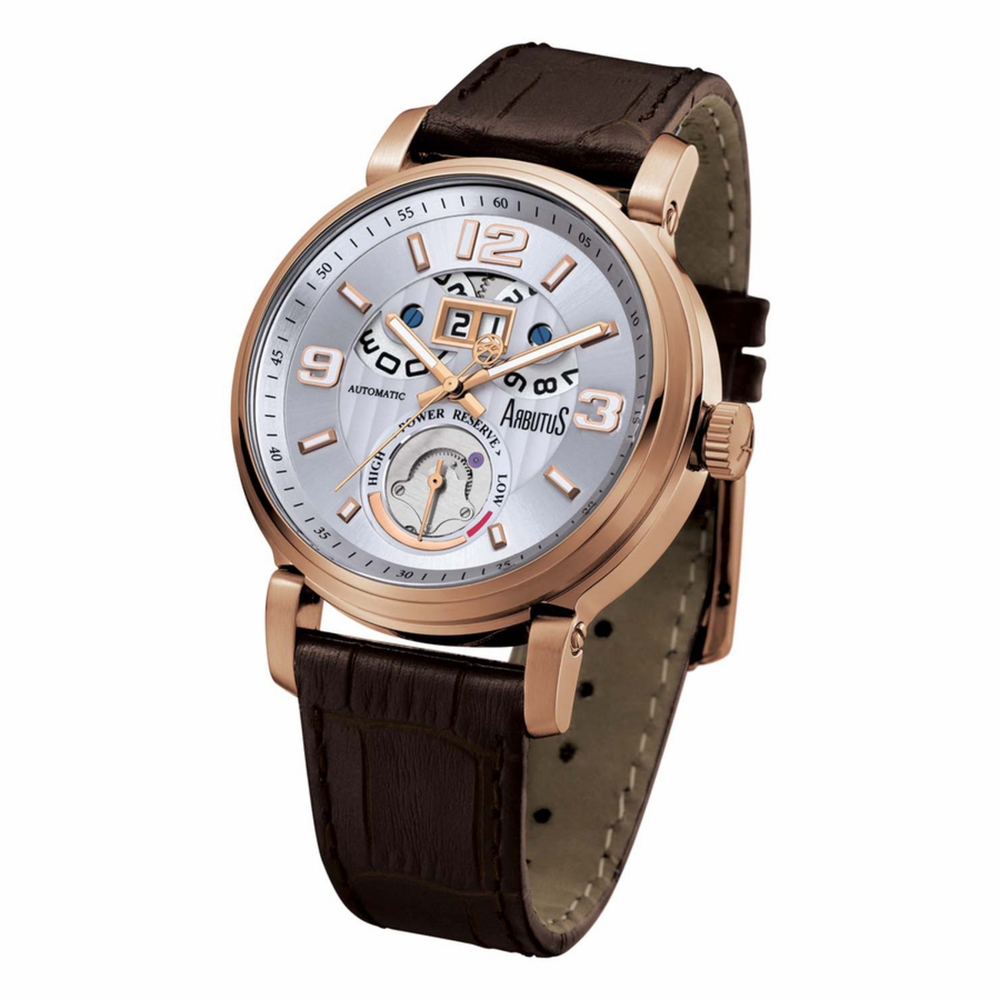 Rose gold-tone stainless steel case with a brown genuine leather strap. Fixed rose gold-tone stainless steel bezel. White dial with rose gold-tone hands and Arabic numeral & index hour markers. Minute markers around the outer rim. Dial Type: Analog. Luminescent hands and markers. Day display at the 12 o'clock position. Automatic movement. Scratch resistant sapphire crystal. Pull / push crown. Transparent case back. Round case shape, case size: 44.5 mm. Band width: 22 mm. Tang clasp. Water resistant at 50 meters / 165 feet. Functions: date, hour, minute, second. Broadway Series. Dress watch style. Arbutus Broadway Automatic White Dial Mens Watch AR1607RWF.