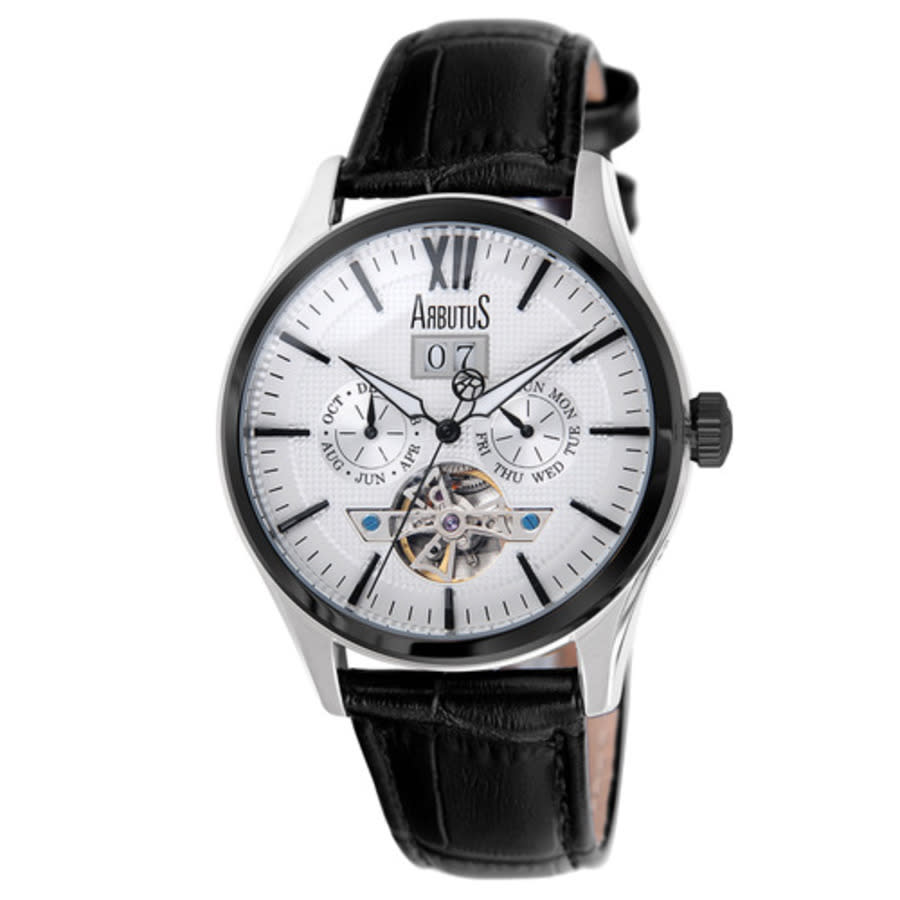 Silver-tone stainless steel case with a black genuine leather strap. Fixed black stainless steel bezel. White dial with black hands and Roman numeral & index hour markers. Minute markers around the outer rim. Dial Type: Analog. Luminescent hands and markers. Date display at the 12 o'clock position. Automatic movement. Scratch resistant sapphire crystal. Pull / push crown. Transparent case back. Round case shape, case size: 43.5 mm. Band width: 22 mm. Tang clasp. Water resistant at 50 meters / 165 feet. Functions: month, date, day, hour, minute, second. Broadway Series. Dress watch style. Arbutus Broadway White Dial Mens Watch AR1614TBWB.
