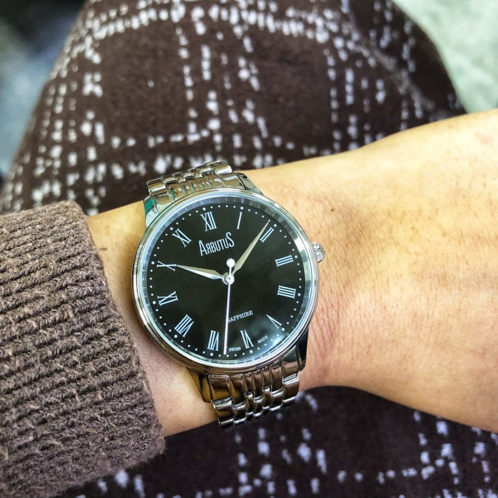 It contains a Swiss-made movement and is assembled in Switzerland Silver-tone stainless steel case and bracelet. Fixed silver-tone stainless steel bezel. Black dial with silver-tone hands and Roman numeral hour markers. Minute markers around the outer rim. Dial Type: Analog. Quartz movement. Scratch resistant sapphire crystal. Pull / push crown. Solid case back. Round case shape, case size: 32 mm. Fold over clasp with a safety release. Water resistant at 50 meters / 165 feet. Functions: hour, minute, second. Swiss-made Collection Series. Dress watch style. Watch label: Swiss Made. Arbutus Swiss-made Collection Quartz Black Dial Ladies Watch ARS1612SBS.