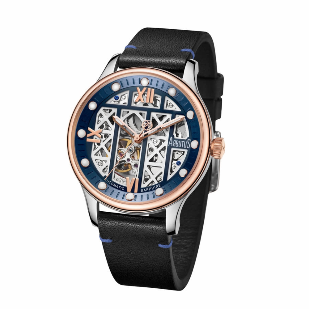 Stainless steel case with a black leather strap. Fixed rose gold-tone bezel. Blue (skeleton center) dial with luminous rose gold-tone hands and dot hour markers. Roman numerals appear at the 3, 6, 9 and 12 o'clock positions. Minute markers around the outer rim. Dial Type: Analog. Luminescent hands and markers. Automatic movement. Scratch resistant sapphire crystal. Pull / push crown. Transparent case back. Round case shape. Case size: 42 mm. Band width: 20 mm. Tang clasp. Water resistant at 50 meters / 165 feet. Functions: hour, minute, second. Wall Street Series. Casual watch style. Arbutus Wall Street Automatic Black Dial Mens Watch AR2101TRUB.