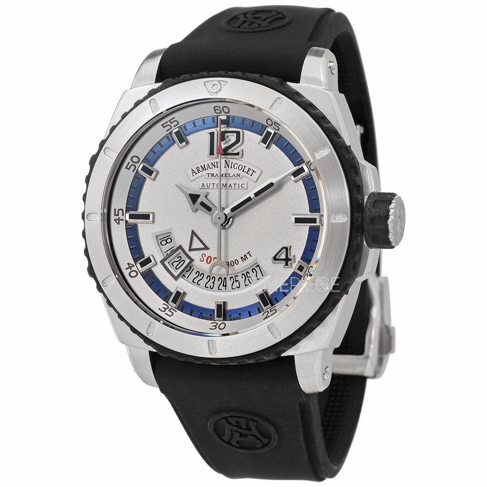 Stainless steel case with a black rubber strap. Fixed stainless steel bezel. Silver dial with luminous silver-tone hands and index hour markers. Arabic numerals appear at the 4 and 12 o'clock positions. Minute markers. Arabic numeral minute markers (at 5 minute intervals) around the outer rim. Dial Type: Analog. Luminescent hands and markers. Date display between the 7 and 8 o'clock positions. Automatic movement. Scratch resistant sapphire crystal. Screw down crown. Solid case back. Round case shape. Case size: 44 mm. Case thickness: 14.1 mm. Band width: 24 mm. Deployment clasp with a push button release. Water resistant at 300 meters / 1000 feet. Functions: date, hour, minute, second. Melrose Collection Sh5 Series. Sport watch style. Watch label: Swiss Made. Armand Nicolet Melrose Collection SH5 Automatic Silver Dial Mens Watch A713BGN-AK-GG4710N.