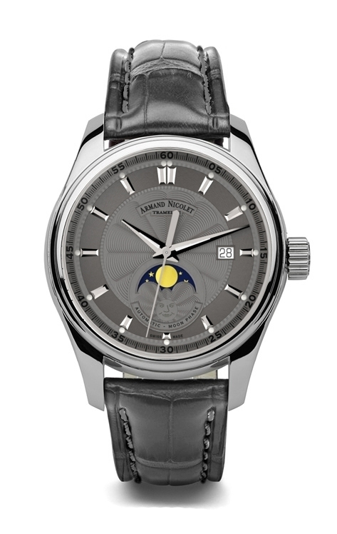 Stainless steel case with a grey leather strap. Fixed stainless steel bezel. Grey dial with silver-tone hands and index hour markers. Arabic numeral minute markers (at 5 minute intervals). Minute markers around the outer rim. Dial Type: Analog. Luminescent hands and markers. Date display at the 3 o'clock position. Moonphase display. Sellita caliber SW280 automatic movement, containing 26 Jewels, bitting at 28800 vph, and has a power reserve of approximately 38 hours. Scratch resistant sapphire crystal. Pull / push crown. Transparent case back. Round case shape. Case size: 43 mm. Case thickness: 13 mm. Band width: 21 mm. Fold over clasp. Water resistant at 100 meters / 330 feet. Functions: moon phase, hour, minute, second. Mh2 Series. Luxury watch style. Watch label: Swiss Made. Armand Nicolet MH2 Moon Phase Automatic Grey Dial Mens Watch A640L-GR-P840GR2.