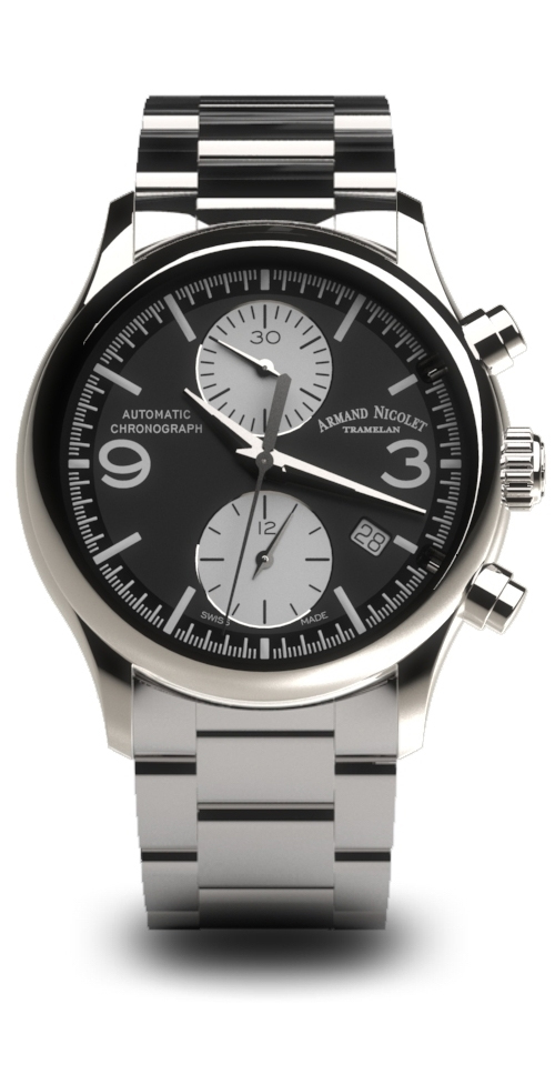 Stainless steel case with a stainless steel bracelet. Fixed stainless steel bezel. Black dial with silver-tone hands and index hour markers. Arabic numeral at the 3 and 9 o'clock positions. Minute markers around the outer rim. Dial Type: Analog. Date display at the 4 o'clock position. Chronograph - two silver sub-dials displaying: 30 minutes and 12 hours. Armand Nicolet calibre SW-500. automatic movement. Scratch resistant sapphire crystal. Pull / push crown. Transparent case back. Round case shape. Case size: 42 mm. Case thickness: 15 mm. Band width: 22 mm. Deployment clasp. Water resistant at 100 meters / 330 feet. Functions: chronograph, date, hour, minute, second. Mha Series. Dress watch style. Watch label: Swiss Made. Armand Nicolet MHA Chronograph Automatic Black Dial Mens Watch A844HAA-NR-M2850A.