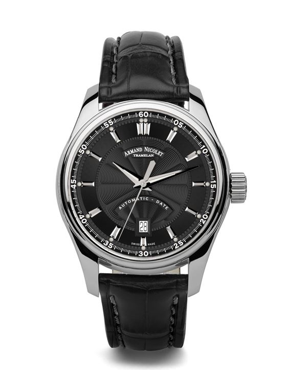 Stainless steel case with a black (calfskin) leather strap. Fixed stainless steel bezel. Black dial with luminous silver-tone hands and index hour markers. Minute markers around the outer rim. Dial Type: Analog. Luminescent hands and markers. Date display at the 6 o'clock position. ETA caliber 2824-2 automatic movement, based upon ETA 2824, containing 25 Jewels, bitting at 28800 vph, and has a power reserve of approximately 38 hours. Scratch resistant sapphire crystal. Screw down crown. Transparent case back. Round case shape. Case size: 43 mm. Case thickness: 13 mm. Band width: 22 mm. Deployment clasp. Water resistant at 100 meters / 330 feet. Functions: date, hour, minute, second. MH2 Series. Luxury watch style. Watch label: Swiss Movt. Armand Nicolet MH2 Automatic Black Dial Mens Watch A640A-NR-P840NR2.