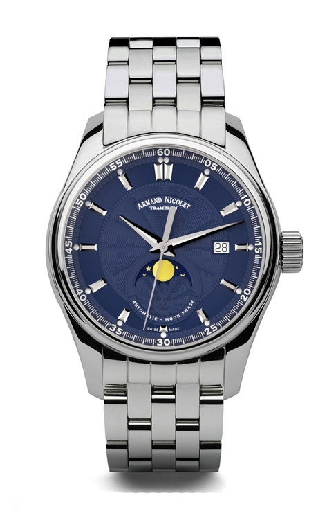 Stainless steel case with a stainless steel bracelet. Fixed stainless steel bezel. Blue dial with luminous silver-tone hands and index hour markers. Arabic numeral minute markers (at 5 minute intervals). Minute markers around the outer rim. Dial Type: Analog. Luminescent hands and markers. Date display at the 3 o'clock position. Moonphase display. Sellita caliber SW280 automatic movement, containing 26 Jewels, bitting at 28800 vph, and has a power reserve of approximately 38 hours. Scratch resistant sapphire crystal. Pull / push crown. Transparent case back. Round case shape. Case size: 42 mm. Case thickness: 13 mm. Fold over clasp with a push button release. Water resistant at 100 meters / 330 feet. Functions: date, moon phase, hour, minute, second. Mh2 Series. Dress watch style. Watch label: Swiss Made. Armand Nicolet MH2 Automatic Blue Dial Mens Watch A640L-BU-MA2640A.
