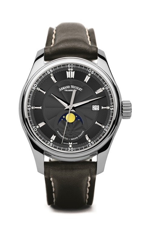 Stainless steel case with a black leather strap. Fixed stainless steel bezel. Black dial with luminous silver-tone hands and index hour markers. Arabic numeral minute markers (at 5 minute intervals). Minute markers around the outer rim. Dial Type: Analog. Luminescent hands and markers. Date display at the 3 o'clock position. Moonphase display. Sellita caliber SW280 automatic movement, containing 26 Jewels, bitting at 28800 vph, and has a power reserve of approximately 38 hours. Scratch resistant sapphire crystal. Transparent case back. Round case shape. Case size: 42 mm. Case thickness: 13 mm. Tang clasp. Water resistant at 100 meters / 330 feet. Functions: date, moon phase, hour, minute, second. Mh2 Series. Dress watch style. Watch label: Swiss Made. Armand Nicolet MH2 Automatic Black Dial Mens Watch A640L-NR-P140NR2.