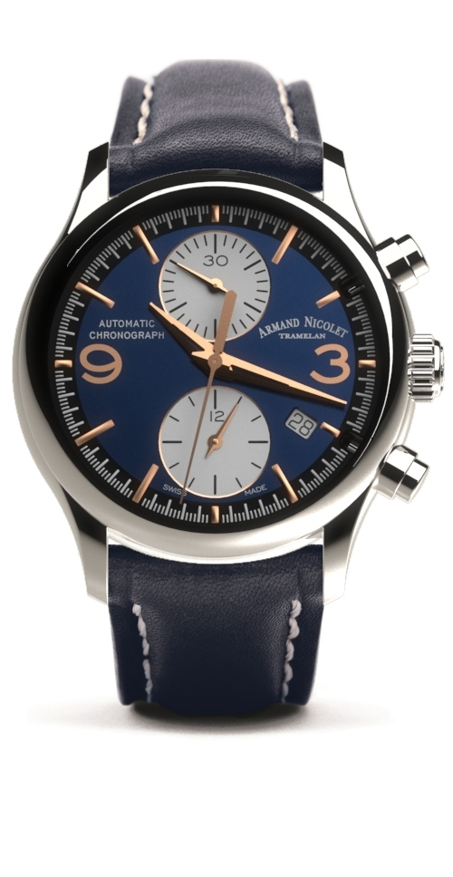 Silver-tone stainless steel case with a blue leather strap. Fixed silver-tone stainless steel bezel. Blue dial with rose gold-tone skeleton hands and index hour markers. Arabic numerals appear at the 3 and 9 o'clock position. Minute markers around the outer rim. Dial Type: Analog. Date display between the 4 and 5 o'clock positions. Chronograph - two sub-dials displaying: 30 minutes and 12 hours. Armand Nicolet Calibre SW-500 automatic movement. Scratch resistant sapphire crystal. Transparent case back. Round case shape, case size: 42 mm, case thickness: 13 mm. Tang clasp. Water resistant at 50 meters / 165 feet. Functions: chronograph, date, hour, minute, second. Mha Series. Luxury watch style. Watch label: Swiss Made. Armand Nicolet MHA Automatic Blue Dial Watch A844HAA-BS-P140BU2.