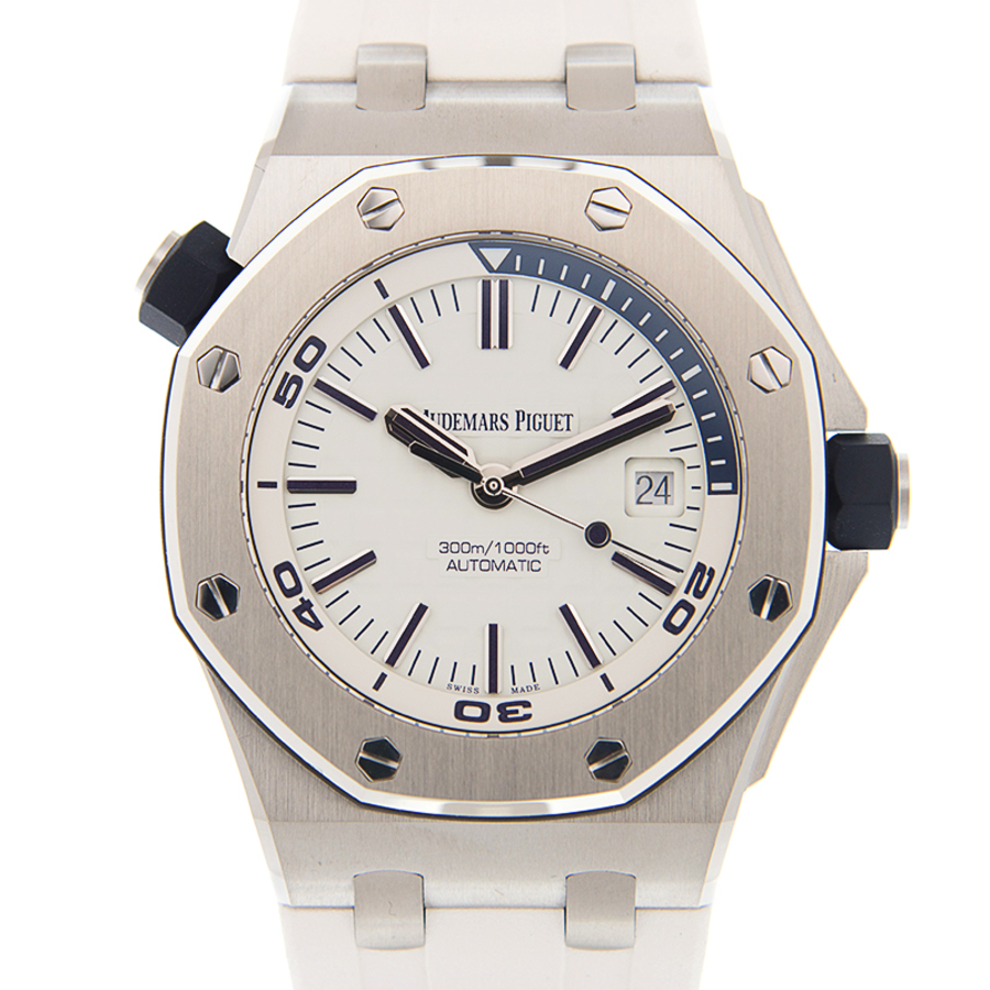 Silver-tone stainless steel case with a white rubber strap. 8 screws fixed silver-tone bezel. White with mega tapisserie pattern dial with silver-tone hands and index hour markers. Minute markers around the outer rim. Dial Type: Analog. Luminescent hands and markers. Date display at the 3 o'clock position. Audemars Piguet Calibre 3120 Automatic movement, containing 40 Jewels, composed of 280 parts, bitting at 21600 vph, and has a power reserve of approximately 60 hours. Scratch resistant sapphire crystal. Screw down crown. Transparent case back. Octagon case shape, case size: 42 mm, case thickness: 14.1 mm. Pin buckle clasp. Water resistant at 300 meters / 1000 feet. Functions: date, hour, minute, second. Additional Info: additional blue rubber strap. Luxury watch style. Watch label: Swiss Made. Audemars Piguet Royal Oak Offshore Watch 15710ST.OO.A010CA.01.