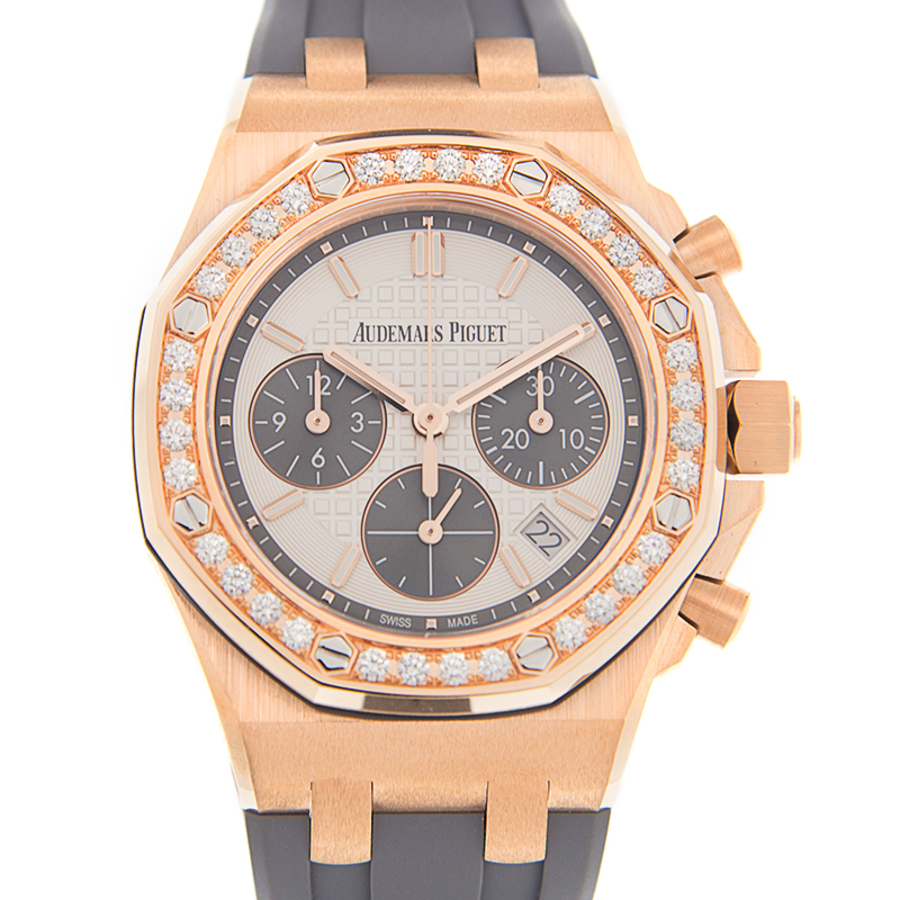 18kt rose gold case with a grey rubber strap. 8 screws fixed 18kt rose gold diamond set bezel. Silver dial with rose gold-tone hands and index hour markers. Minute markers around the outer rim. Dial Type: Analog. Luminescent hands. Date display between 4 and 5 o'clock position. Chronograph - three sub-dials displaying: 60 second, 30 minute and 12 hours. Audemars Piguet Calibre 2385 Automatic movement, containing 37 Jewels, composed of 304 parts, bitting at 21600 vph, and has a power reserve of approximately 40 hours. Scratch resistant sapphire crystal. Screw down crown. Solid case back. Octagon case shape, case size: 37 mm, case thickness: 12.4 mm. Deployment clasp. Water resistant at 50 meters / 165 feet. Functions: chronograph, date, hour, minute, second. Additional Info: bezel with 32 brilliant-cut diamonds (~1.02 carats). Royal Oak Offshore Series. Luxury watch style. Watch label: Swiss Made. Audemars Piguet Royal Oak Offshore Chronograph Automatic Silver Dial Ladies Watch 26231OR.ZZ.D003CA.01.