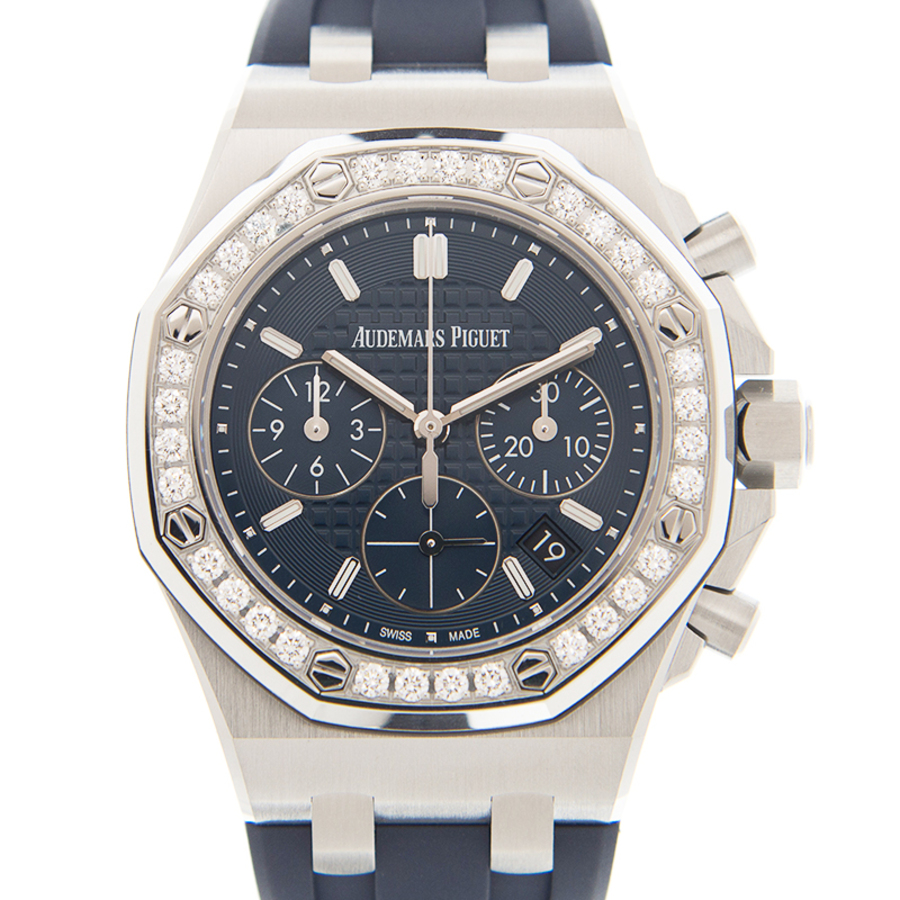 Silver-tone stainless steel case with a blue rubber strap. 8 screws fixed silver-tone diamond set bezel. Blue dial with silver-tone hands and index hour markers. Minute markers around the outer rim. Dial Type: Analog. Luminescent hands and markers. Date display between 4 and 5 o'clock position. Chronograph - three sub-dials displaying: 60 second, 30 minute and 12 hours. Audemars Piguet Calibre 2385 Automatic movement, containing 37 Jewels, composed of 304 parts, bitting at 21600 vph, and has a power reserve of approximately 40 hours. Scratch resistant sapphire crystal. Screw down crown. Solid case back. Octagon case shape, case size: 37 mm, case thickness: 11.8 mm. Ap fold over clasp. Water resistant at 50 meters / 165 feet. Functions: chronograph, column wheel, date, hour, minute, small second. Additional Info: bezel set with 32 brilliant-cut diamonds ; ~1.02 carats. Luxury watch style. Watch label: Swiss Made. Audemars Piguet Automatic Diamond Blue Dial Ladies Watch 26231ST.ZZ.D027CA.01.