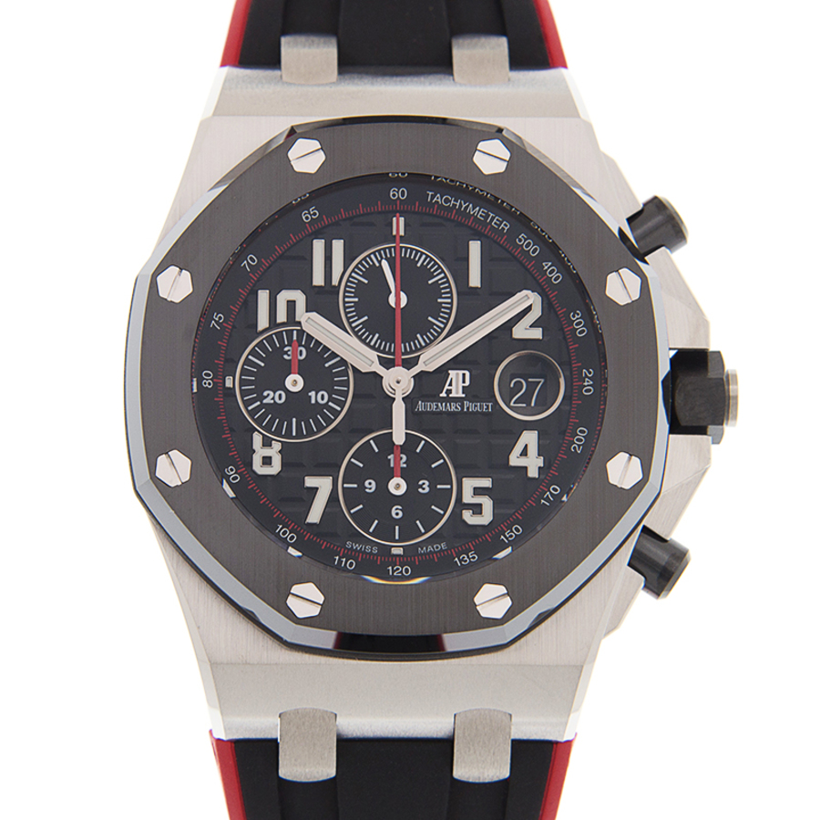 Stainless steel case with a black rubber strap. Fixed black ceramic bezel. Black dial with silver-tone hands and Arabic numeral hour markers. Tachymeter around the outer rim. Dial Type: Analog. Luminescent hands. Date display between 4 and 5 o'clock position. Chronograph - three sub-dials displaying: 60 second, 30 minute and 12 hour. Audemars Piguet Calibre 2385 Automatic movement, containing 37 Jewels, composed of 304 parts, bitting at 21600 vph, and has a power reserve of approximately 40 hours. Scratch resistant sapphire crystal. Screw down crown. Solid case back. Octagon case shape, case size: 54 mm x 42 mm, case thickness: 14.5 mm. Band width: 20.3 mm, band length: 8 inches. Pin buckle clasp. Water resistant at 50 meters / 165 feet. Functions: chronograph, column wheel, date, hour, minute, small second. Sport watch style. Watch label: Swiss Made. Audemars Piguet Royal Oak Offshore Chronograph Automatic Mens Watch 26470SO.OO.A002CA.01.