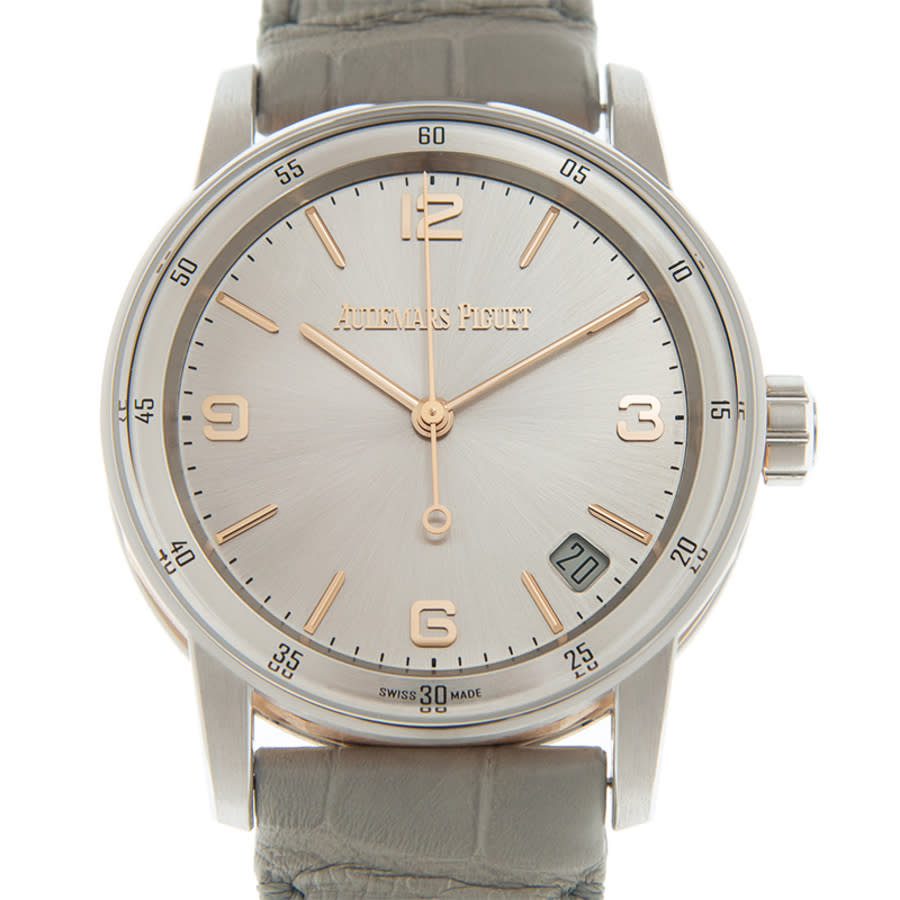18kt rose gold case with a grey alligator band. Fixed 18kt white gold bezel. Silver-tone dial with index-Arabic numeral hour markers. Dial Type: Analog. Date display between 4 and 5 o'clock position. Audemars Piguet Calibre 4302 Automatic movement, containing 32 Jewels, bitting at 28800 vph, and has a power reserve of approximately 70 hours. Scratch resistant sapphire crystal. Screw down crown. Transparent see through case back. Case size: 41 mm, case thickness: 10.7 mm. Tang clasp. Water resistant at 30 meters / 100 feet. Functions: date, hour, minute, second. Code 11.59 Series. Luxury watch style. Watch label: Swiss Made. Audemars Piguet CODE 11.59 Automatic Silver Dial Mens Watch 15210CR.OO.A009CR.01.