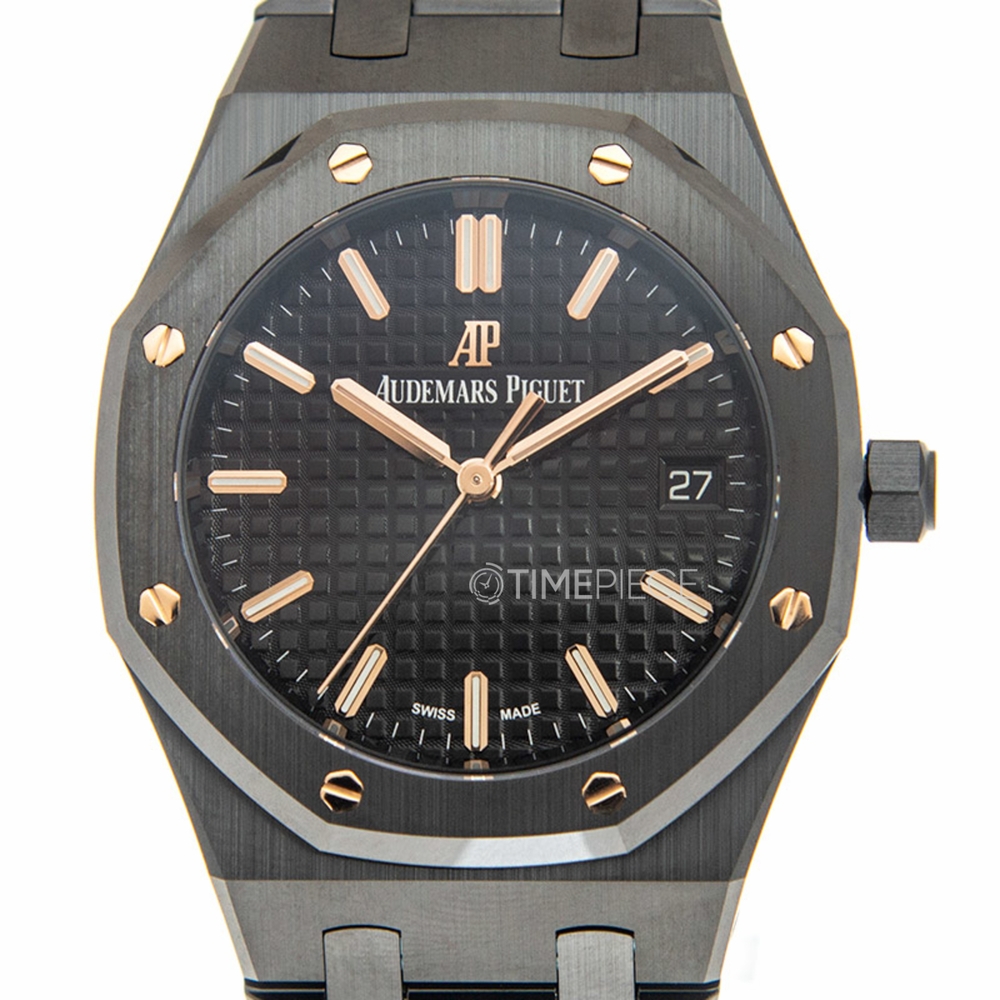 Black ceramic bracelet. Fixed ceramic bezel. Black dial with index hour markers. Dial Type: Analog. Date display at the 3 o'clock position. Audemars Piguet Calibre 5800 Automatic movement, containing 28 Jewels, composed of 189 parts, bitting at 28800 vph, and has a power reserve of approximately 50 hours. Scratch resistant sapphire crystal. Screw down crown. Transparent see through case back. Case size: 34, case thickness: 8.8. Water resistant at 50 meters / 165 feet. Functions: hour, minute, second. Royal Oak Series. Sport watch style. Watch label: Swiss Made. Audemars Piguet Royal Oak Automatic Black Dial Ladies Watch 77350CE.OO.1266CE.01.