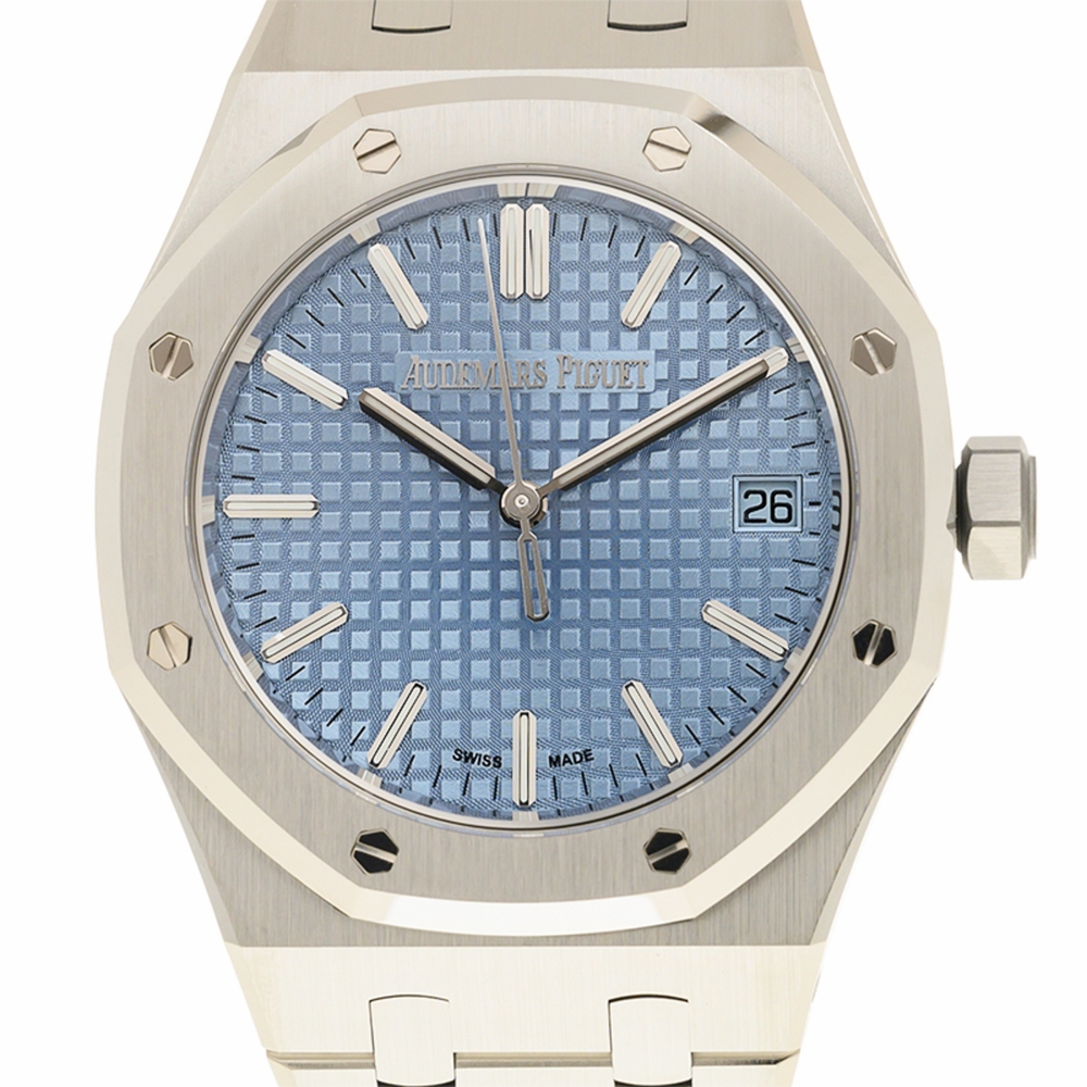 Silver-tone stainless steel case and bracelet. Fixed silver-tone stainless steel bezel. Blue dial with silver-tone hands and index hour markers. Minute markers around the outer rim. Dial Type: Analog. Luminescent hands and markers. Date display at the 3 o'clock position. Audemars Piguet Calibre 5900 automatic movement. Scratch resistant sapphire crystal. Screw down crown. Round case shape, case size: 37 mm, case thickness: 9 mm. Fold over clasp with a safety release. Water resistant at 50 meters / 165 feet. Functions: date, hour, minute, second. Additional Info: original box, international warranty card, manual (complete accessories). Royal Oak "50th Anniversary" Series. Luxury watch style. Watch label: Swiss Made. Audemars Piguet Royal Oak "50th Anniversary" Automatic Blue Dial Unisex Watch 15550ST.OO.1356ST.04.