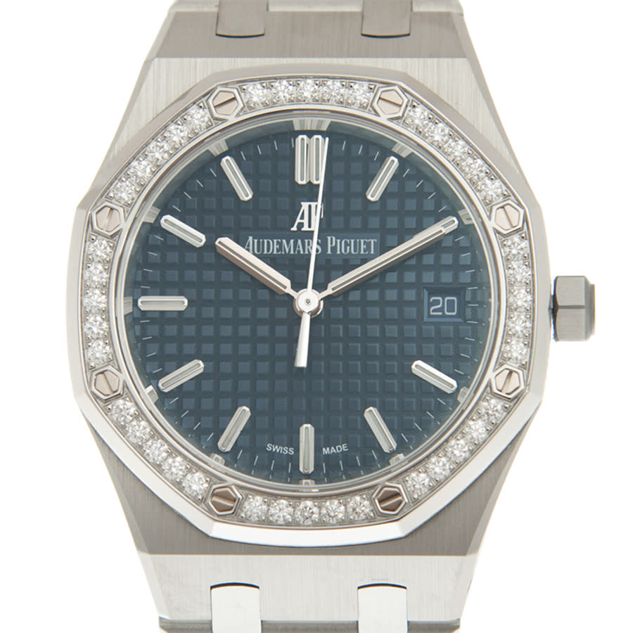 Silver-tone stainless steel case and bracelet. Fixed silver-tone bezel with diamond set. Blue dial with silver-tone hands and index hour markers. Minute markers around the outer rim. Dial Type: Analog. Date display at the 3 o'clock position. Audemars Piguet Calibre 5800 Automatic movement, containing 28 Jewels, composed of 189 parts, bitting at 28800 vph, and has a power reserve of approximately 50 hours. Scratch resistant sapphire crystal. Transparent see through case back. Octagon case shape, case size: 34 mm, case thickness: 8.8 mm. Deployment with push button release clasp. Water resistant at 50 meters / 165 feet. Functions: date, hour, minute, second. Royal Oak Series. Luxury watch style. Watch label: Swiss Made. Audemars Piguet Royal Oak Automatic Diamond Blue Dial Ladies Watch 77351ST.ZZ.1261ST.01.