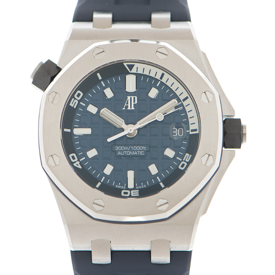Silver-tone stainless steel case with a blue rubber strap. Fixed silver-tone stainless steel bezel. Blue dial with silver-tone hands and index hour markers. Minute markers around the outer rim. Dial Type: Analog. Luminescent hands and markers. Date display at the 3 o'clock position. Automatic movement. Scratch resistant sapphire crystal. Screw down crown. Transparent see through case back. Round case shape, case size: 42 mm. Buckle clasp. Water resistant at 300 meters / 1000 feet. Functions: date, hour, minute, second. Additional Info: original box, international warranty card, manual (complete accessories). Royal Oak Offshore Series. Luxury watch style. Watch label: Swiss Made. Audemars Piguet Royal Oak Offshore Automatic Blue Dial Unisex Watch 15720ST.OO.A027CA.01.