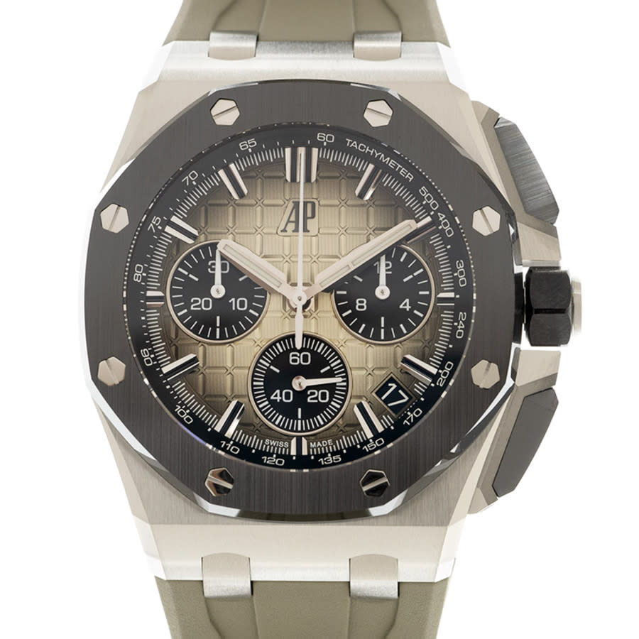 Silver-tone stainless steel case with a grey rubber strap. Fixed black stainless steel bezel. Grey dial with silver-tone hands and index hour markers. Minute markers around the outer rim. Dial Type: Analog. Luminescent hands and markers. Date display between 4 and 5 o'clock position. Chronograph - three sub-dials displaying: 60 second, 30 minute and 12 hour. Audemars Piguet Calibre 4401 Automatic movement, containing 40 Jewels, composed of 367 parts, bitting at 28800 vph, and has a power reserve of approximately 70 hours. Scratch resistant sapphire crystal. Screw down crown. Transparent see through case back. Round case shape, case size: 43 mm, case thickness: 14.4 mm. Buckle clasp. Water resistant at 100 meters / 330 feet. Functions: chronograph, column wheel, flyback, date, hour, minute, second. Additional Info: original box, international warranty card, manual (complete accessories). Royal Oak Offshore Series. Luxury watch style. Watch label: Swiss Made. Audemars Piguet Royal Oak O