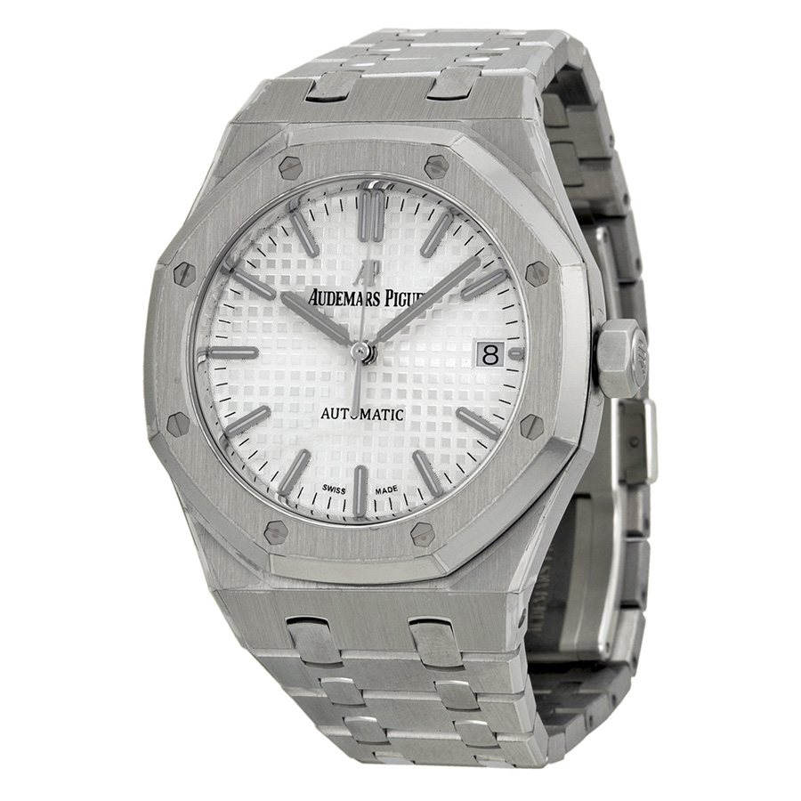 Silver-tone stainless steel case with a silver-tone stainless steel bracelet. Fixed 22kt white gold bezel. Silver (grand tapisserie) dial with silver-tone hands and stick hour markers. Minute markers around the outer rim. Dial Type: Analog. Luminescent hands and markers. Date display at the 3 o'clock position. Audemars Piguet Calibre 3120 Automatic movement, containing 40 Jewels, composed of 280 parts, bitting at 21600 vph, and has a power reserve of approximately 60 hours. Scratch resistant sapphire crystal. Screw locked crown. Skeleton case back. Octagonal case shape, case size: 37 mm, case thickness: 9.8 mm. Band width: 19.05 mm, band length: 7.5 inches. Deployment with push button release clasp. Water resistant at 50 meters / 165 feet. Functions: date, hour, minute, second. Luxury watch style. Watch label: Swiss Made. Item Variations: 15450ST OO 1256ST 01, 15450ST-OO-1256ST-01, 15450STOO1256ST01. Audemars Piguet Royal Oak Automatic Silver Dial Stainless Steel Unisex Watch 15450ST.OO.1256ST.01.