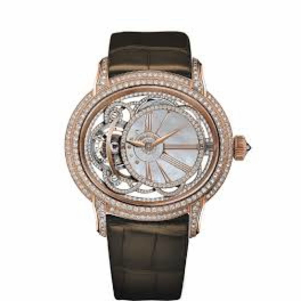 18 carat rose gold case with a brown alligator leather strap. Fixed bezel. White mother of pearl dial with rose gold-tone hands and Roman numeral hour markers. Dial Type: Analog. Hand wound movement. Manufacture 2940 engine. Scratch resistant sapphire crystal. Skeleton transparent exhibition see through case back. Case diameter: 45 mm. Case thickness: 11.70 mm. Oval case shape. Water resistant at 200 meters / 660 feet. Functions: hour, minute, tourbillion. Additional Info: Case and buckle set with 424 brilliant-cut diamonds; ~3.95 carats, rings set with 151 brilliant-cut diamonds; ~0.41 carats, movement set with 213 brilliant-cut diamonds; ~0.25 carats. Luxury watch style. Watch label: Swiss Made. Audemars Piguet Millenary Tourbillion White Mother Of Pearl Dial Ladies Diamond Watch 26354OR.ZZ.D812CR.01.