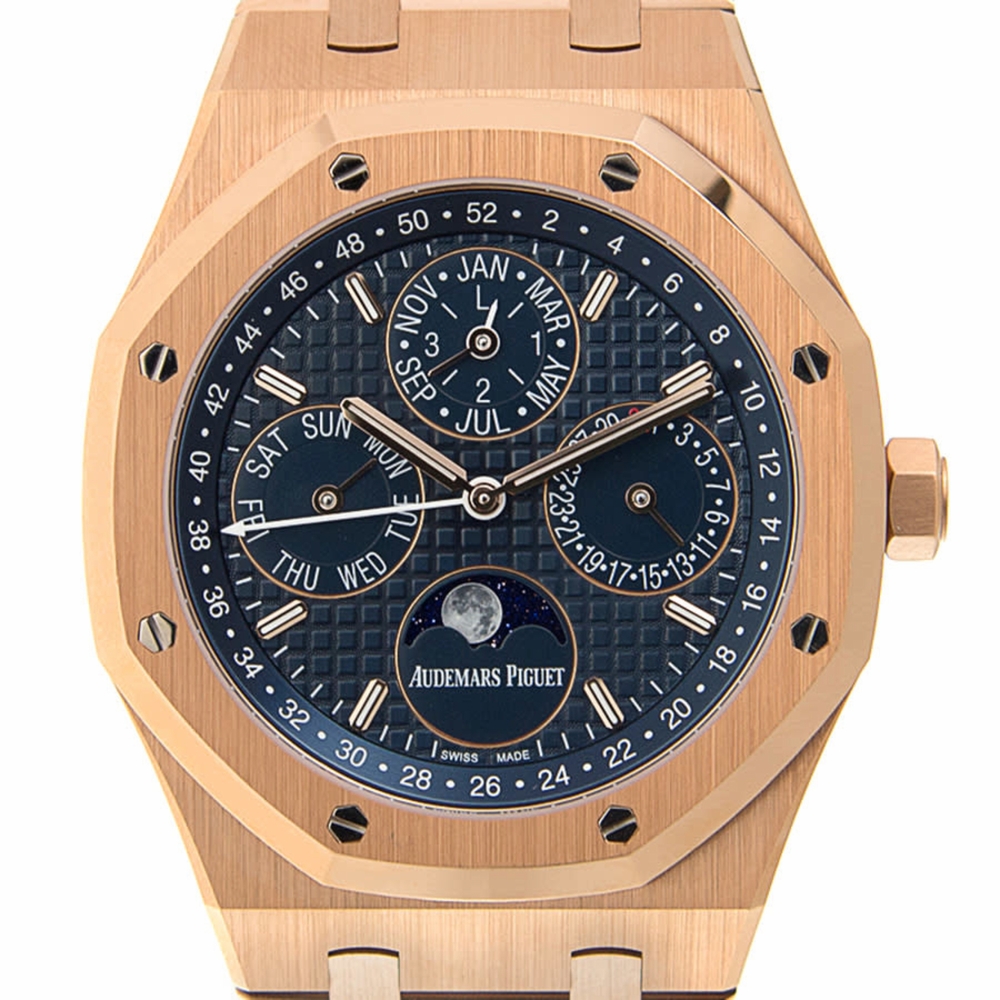 18kt pink gold case with a 18kt pink gold bracelet. 8 screws fixed 18kt pink gold bezel. Blue dial with pink gold hands and index hour markers. Dial Type: Analog. Luminescent hands and markers. Perpetual calendar. Four sub-dials displaying: month, moonphase, date and day of the week. Audemars Piguet Calibre 5134 Automatic movement, based upon Audemars Piguet 2120, containing 38 Jewels, composed of 374 parts, bitting at 19800 vph, and has a power reserve of approximately 40 hours. Scratch resistant sapphire crystal. Screw down crown. Skeleton transparent exhibition see through case back. Octagon case shape, case size: 41 mm, case thickness: 9.5 mm. Deployment with push button release clasp. Water resistant at 200 meters / 660 feet. Functions: perpetual calendar, moon phase, week number, leap year, month, date, day, hour, minute. Royal Oak Prepetual Calendar Series. Luxury watch style. Watch label: Swiss Made. Audemars Piguet Royal Oak Prepetual Calendar Blue Dial Automatic Mens 18 Carat Pink Gold Watch 26574OR.OO.1220OR.02.
