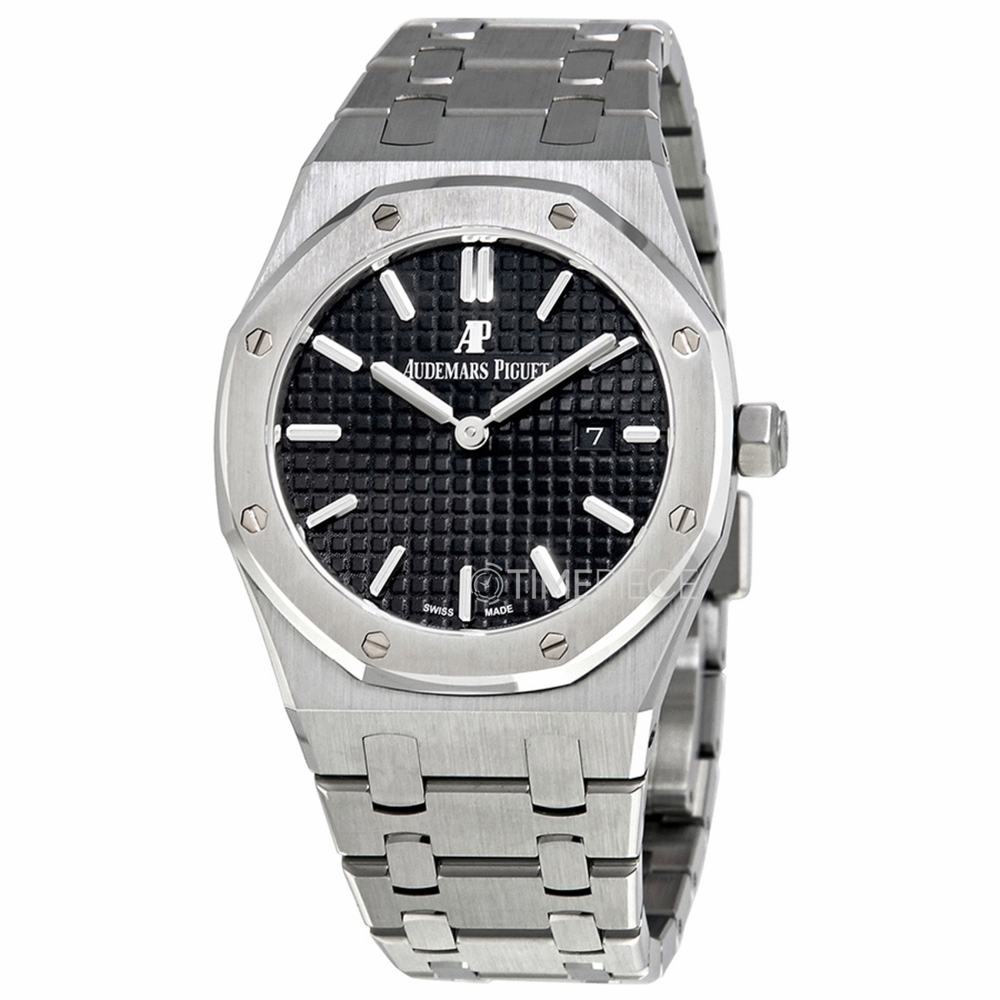Silver-tone stainless steel case with a silver-tone stainless steel bracelet. Fixed silver-tone stainless steel bezel. Black (grande tapisserie) dial with silver-tone hands and index hour markers. Dial Type: Analog. Luminescent hands and markers. Date display at the 3 o'clock position. Audemars Piguet Calibre 2713 quartz movement. Scratch resistant sapphire crystal. Screw down crown. Solid case back. Octagon case shape, case size: 33 mm, case thickness: 7 mm. Deployment clasp. Water resistant at 50 meters / 165 feet. Functions: date, hour, minute. Luxury watch style. Watch label: Swiss Made. Audemars Piguet Royal Oak Ladies Watch 67650ST.OO.1261ST.01.