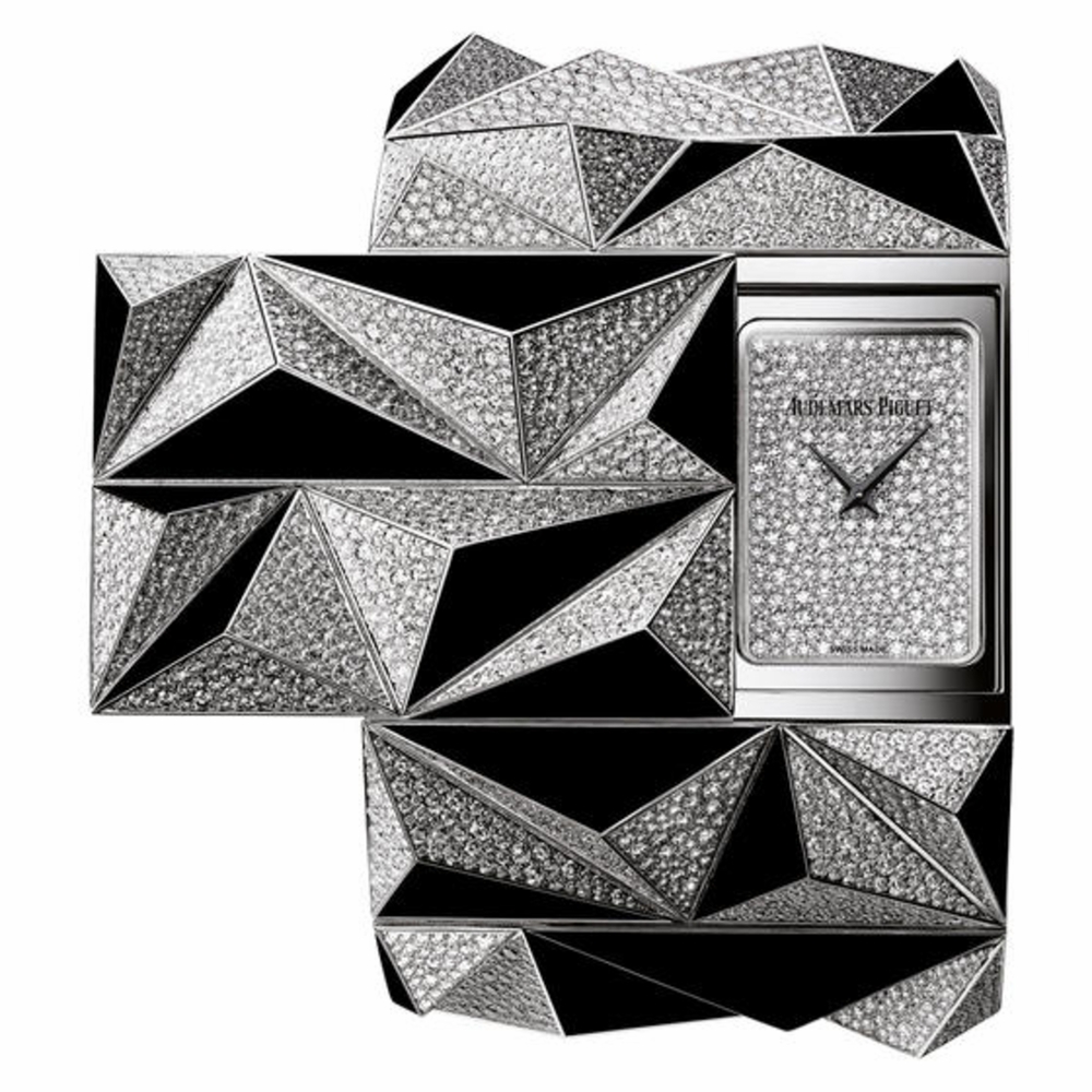 18 carat white gold set with diamonds case with a 18 carat white gold set with diamonds bracelet. Fixed bezel. Diamond pave dial with blackened gold hands. Dial Type: Analog. Quartz movement. Calibre 2601 engine. Scratch resistant sapphire crystal. Case diameter: 44 mm. Case thickness: 12.20 mm. Unique case shape. Functions: hour, minute. Additional Info: dial set with 300 brilliant-cut diamonds; (~0.92 carats), case set with 5,326 brilliant-cut diamonds; (~21.66 carats), 56 onyx elements. Luxury watch style. Watch label: Swiss Made. Audemars Piguet Haute Joaillerie Diamond Punk Diamond Pave Dial Ladies 18 Carat White Gold Watch 79419BC.ZO.9189BC.01.