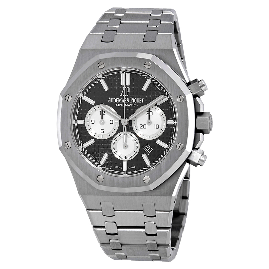 Silver-tone stainless steel case with a silver-tone stainless steel bracelet. 8 screws fixed silver-tone stainless steel bezel. Black dial with silver-tone hands and index hour markers. Minute markers around the outer rim. Dial Type: Analog. Luminescent hands and markers. Date display between 4 and 5 o'clock position. Chronograph - three sub-dials displaying: 60 second, 30 minute and 12 hours. Audemars Piguet Calibre 2385 Automatic movement, containing 37 Jewels, composed of 304 parts, bitting at 21600 vph, and has a power reserve of approximately 40 hours. Scratch resistant sapphire crystal. Screw down crown. Solid case back. Octagon case shape, case size: 41 mm, case thickness: 11 mm. Butterfly clasp. Water resistant at 50 meters / 165 feet. Functions: chronograph, column wheel, date, hour, minute, small second. Luxury watch style. Watch label: Swiss Made. Audemars Piguet Royal Oak Black Dial Automatic Mens Chronograph Watch 26331ST.OO.1220ST.02.