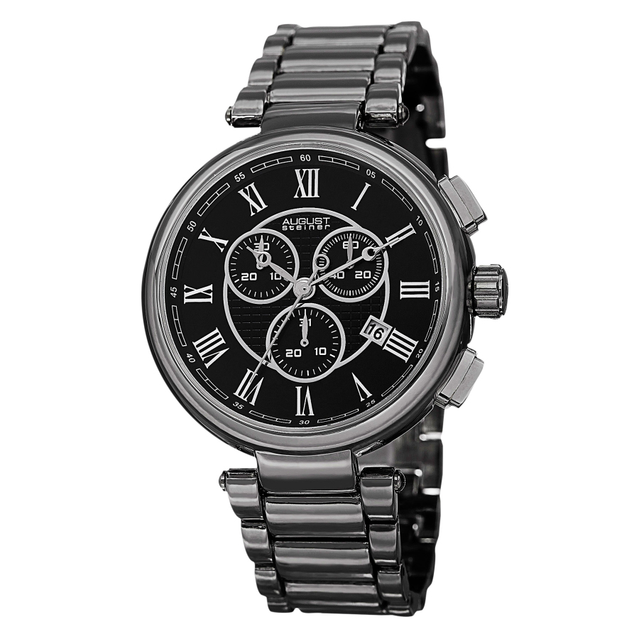 Composite case with a alloy bracelet. Fixed composite bezel. Black dial with silver-tone Breguet-style shape hands and Roman numeral hour markers. Minute markers around the outer rim. Dial Type: Analog. Date display at the 4 o'clock position. Quartz movement. Scratch resistant mineral crystal. Pull / push crown. Solid case back. Round case shape, case size: 44 mm, case thickness: 12 mm. Band width: 24 mm, band length: 8 inches. Fold over clasp. Water resistant at 10 meters / 33 feet. Functions: chronograph, hour, minute, second. Fashion watch style. August Steiner Chronograph Black Dial Mens Watch AS8148BK.