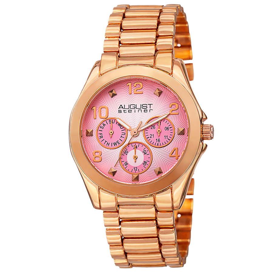 Gold-tone composite case with a gold-tone alloy bracelet. Fixed gold-tone bezel. Pink dial with gold-tone alpha-style shape hands and Arabic numeral and index hour markers. Dial Type: Analog. Luminescent hands. Date display at the 3 o'clock position. Three - date, day, 24 hour subdials. Quartz movement. Scratch resistant mineral crystal. Pull / push crown. Solid case back. Round case shape, case size: 37 mm, case thickness: 9 mm. Band width: 19 mm, band length: 8 inches. Jewelry clasp. Water resistant at 10 meters / 33 feet. Functions: date, day, GMT, second time zone, hour, minute, second. Fashion watch style. August Steiner Quartz Pink Dial Ladies Watch AS8150RG.