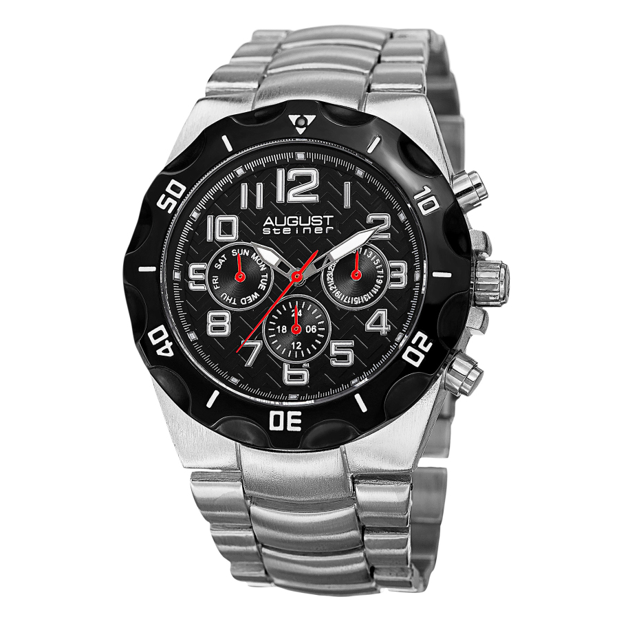 Silver-tone composite case with a silver-tone alloy bracelet. Fixed black bezel. Black dial with silver-tone sword-shaped hands and Arabic numeral hour markers. Minute markers around the outer rim. Dial Type: Analog. Date display at the 3 o'clock position. Three - date, day, 24 hour subdials. Quartz movement. Scratch resistant mineral crystal. Pull / push crown. Solid case back. Round case shape, case size: 44 mm, case thickness: 11 mm. Band width: 28 mm, band length: 8 inches. Fold over clasp. Water resistant at 10 meters / 33 feet. Functions: date, day, GMT, second time zone, hour, minute, second. Fashion watch style. August Steiner Quartz Black Dial Mens Watch AS8161SSB.