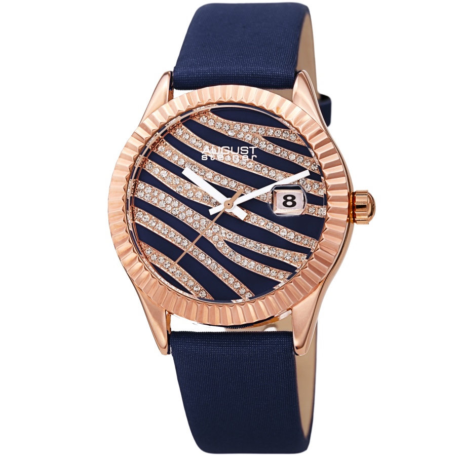 Rose gold-tone composite metal case with a blue leather strap. Fixed fluted rose gold-tone composite metal bezel. Blue and rose zebra pattern (crystal-set) dial with white hands. No markers. Dial Type: Analog. Date display at the 3 o'clock position. Quartz movement. Scratch resistant mineral crystal. Pull / push crown. Solid case back. Round case shape. Case size: 36 mm. Case thickness: 8.5 mm. Band width: 18 mm. Band length: 8.5 inches. Tang clasp. Water resistant at 30 meters / 100 feet. Functions: date, hour, minute, second. Fashion watch style. August Steiner Blue and Rose Gold Dial Ladies Watch AS8275BU.