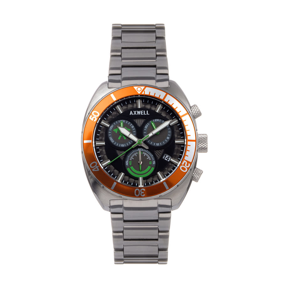 Band Color: Silver Stainless Steel; Band Width: 20mm near case; 18mm near clasp/buckle; Bezel Color: Orange; Case: Silver + Circle-Shaped; Case Finish: Brushed + Stainless Steel; Case Thickness: 13mm; Case Width: 42mm; 45mm with Crown; Clasp / Buckle: Fold Over Push Button Deployment; Dial: Black + Analog; Hand Color: Silver; Movement: Japanese + Quartz; Time Zones: Single; Water Resistance: 20 ATM.
