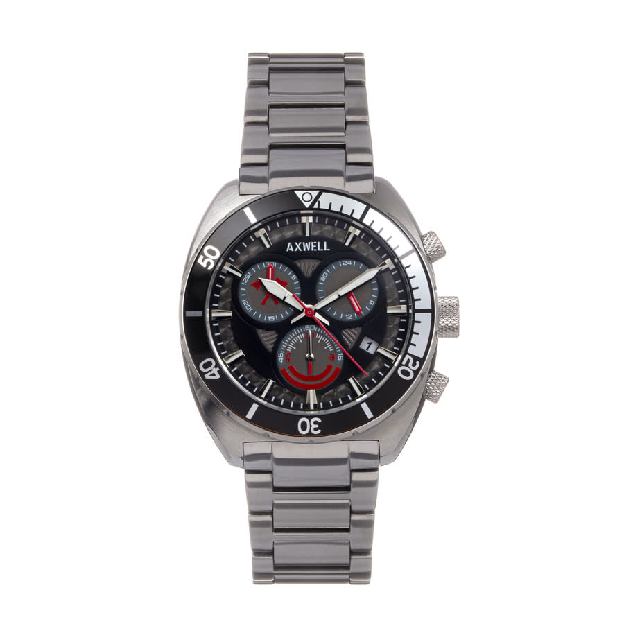 Band Color: Silver Stainless Steel; Band Width: 20mm near case; 18mm near clasp/buckle; Bezel Color: Black; Case: Silver + Circle-Shaped; Case Finish: Brushed + Stainless Steel; Case Thickness: 13mm; Case Width: 42mm; 45mm with Crown; Clasp / Buckle: Fold Over Push Button Deployment; Dial: Black + Analog; Hand Color: Silver; Movement: Japanese + Quartz; Time Zones: Single; Water Resistance: 20 ATM.