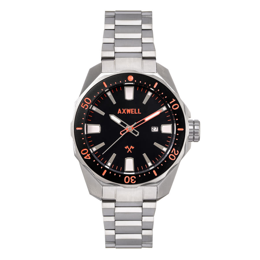 Band Color: Silver Stainless Steel; Band Width: 20mm near case; 18mm near clasp/buckle; Bezel Color: Black; Case: Silver + Circle-Shaped; Case Finish: Brushed + Stainless Steel; Case Thickness: 13mm; Case Width: 44mm; 48mm with Crown; Clasp / Buckle: Fold Over Push Button Deployment; Dial: Black + Analog; Hand Color: Silver & Orange; Movement: Japanese + Quartz; Time Zones: Single; Water Resistance: 20 ATM. Silver-tone stainless steel case and bracelet. Uni-directional rotating black stainless steel bezel. Black dial with silver-tone hands and index hour markers. Minute markers around the outer rim. Dial Type: Analog. Luminescent hands and markers. Date display at the 3 o'clock position. Quartz movement. Scratch resistant mineral crystal. Solid case back. Round case shape, case size: 44 mm, case thickness: 13 mm. Band width: 20 mm, band length: 9 inches. Deployment with push button release clasp. Water resistant at 200 meters / 660 feet. Functions: date, hour, minute, second. Timber Series. Casual watch style. Watch label: Japan Movt. Axwell Timber Quartz Black Dial Mens Watch AXWAW107-2.