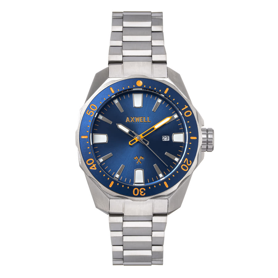 Band Color: Silver Stainless Steel; Band Width: 20mm near case; 18mm near clasp/buckle; Bezel Color: Navy; Case: Silver + Circle-Shaped; Case Finish: Brushed + Stainless Steel; Case Thickness: 13mm; Case Width: 44mm; 48mm with Crown; Clasp / Buckle: Fold Over Push Button Deployment; Dial: Navy + Analog; Hand Color: Silver & Orange; Movement: Japanese + Quartz; Time Zones: Single; Water Resistance: 20 ATM. Silver-tone stainless steel case and bracelet. Uni-directional rotating blue stainless steel bezel. Blue dial with silver-tone hands and index hour markers. Minute markers around the outer rim. Dial Type: Analog. Luminescent hands and markers. Date display at the 3 o'clock position. Quartz movement. Scratch resistant mineral crystal. Solid case back. Round case shape, case size: 44 mm, case thickness: 13 mm. Band width: 20 mm, band length: 9 inches. Deployment with push button release clasp. Water resistant at 200 meters / 660 feet. Functions: date, hour, minute, second. Timber Series. Casual watch style. Watch label: Japan Movt. Axwell Timber Quartz Blue Dial Mens Watch AXWAW107-3.
