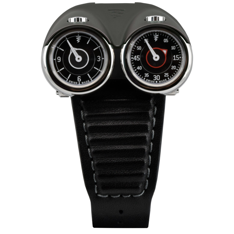 Black stainless steel case with a black leather strap. Fixed black stainless steel bezel. Black dial with silver-tone hands and Arabic numeral hour markers. Minute markers around the outer rim. Dial Type: Analog. ETA Caliber 2512-1 hand wind movement. Scratch resistant sapphire crystal. Pull / push crown. Solid case back. Unique case shape, case size: 50 mm, case thickness: 25 mm. Band width: 32 mm. Fold over clasp. Water resistant at 30 meters / 100 feet. Functions: hour, minute, second. Additional Info: limited edition 88 pcs. Sp-1 Series. Luxury watch style. Watch label: Swiss Made. Azimuth SP-1 Hand Wind Black Dial Mens Watch SP.SS.TT.N002.