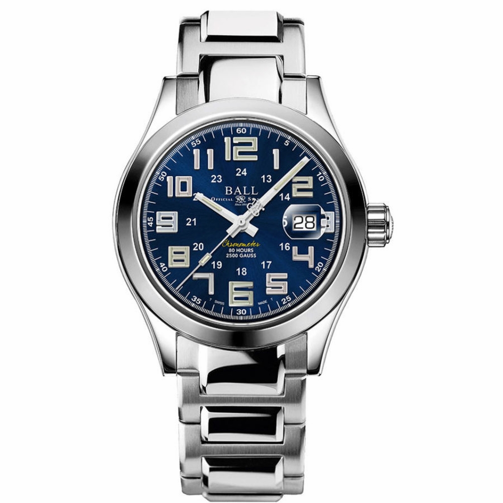 Silver-tone stainless steel case and bracelet. Fixed silver-tone stainless steel bezel. Blue dial with silver-tone hands and Arabic numeral hour markers. Minute markers around the outer rim. Dial Type: Analog. Luminescent hands and markers. Date display at the 3 o'clock position. Ball Calibre RRM7309-C Automatic movement, containing 25 Jewels, bitting at 28800 vph, and has a power reserve of approximately 80 hours. Scratch resistant sapphire crystal. Screw down crown. Transparent case back. Round case shape, case size: 40 mm. Fold over clasp. Water resistant at 100 meters / 330 feet. Functions: date, hour, minute, second, chronometer. Engineer M Pioneer Series. Casual watch style. Watch label: Swiss Made. Ball Engineer M Pioneer Automatic Chronometer Blue Dial Mens Watch NM9032C-S2C-BE2.